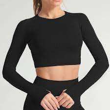 ชุดโยคะเอวสูงของผู้หญิงเสื้อครอปแขนยาวตกแต่งลูกไม้เสื้อคอปกเสื้อออกกำลังกายเสื้อถักนิตติ้ง