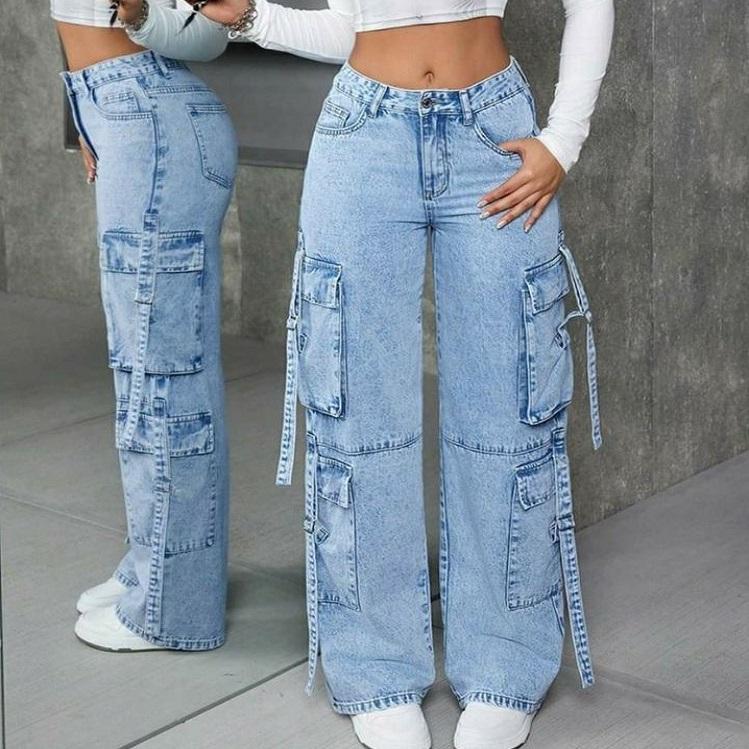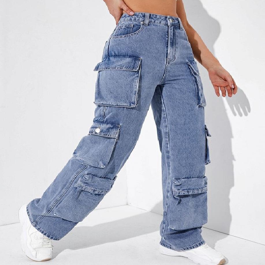กางเกงยีนส์เอวสูงสำหรับผู้หญิงกางเกงยีนส์ขาบานมีกระเป๋าแบบมีฝาปิดกางเกงขายาวทรงตรงมีกระเป๋าขนาดใหญ่ขายส่ง