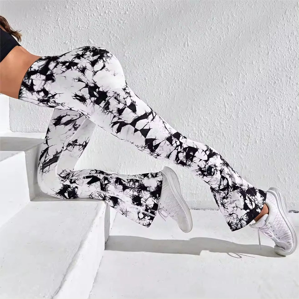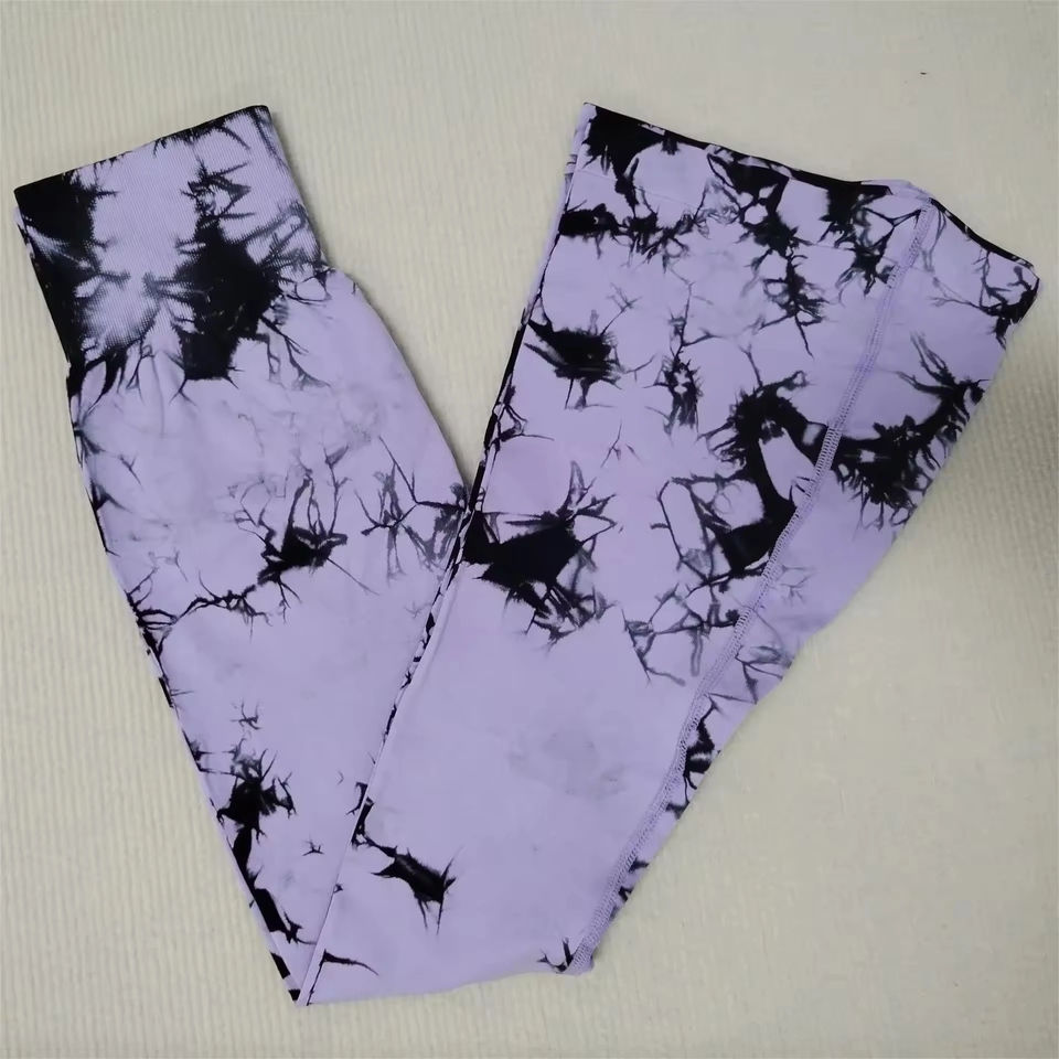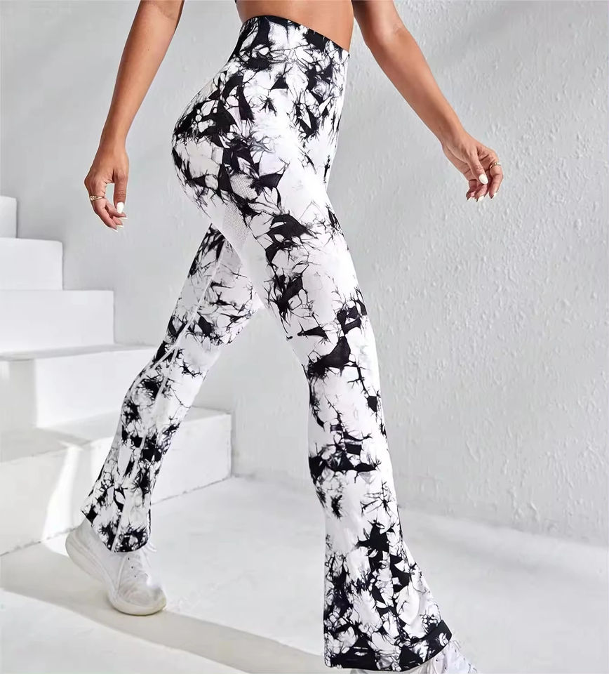 กางเกงโยคะขาบานเอวสูงสำหรับผู้หญิงเลกกิ้งโยคะกระฉอกพร้อมท้องควบคุมรูปแบบสีทึบบาน
