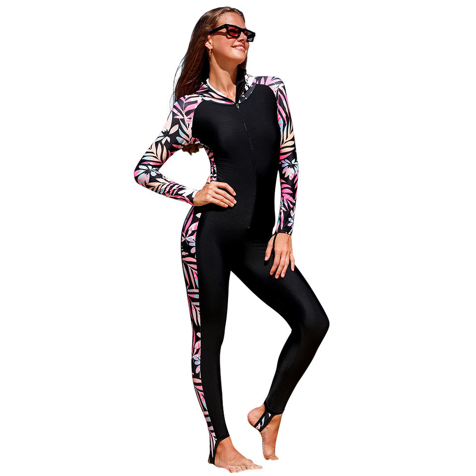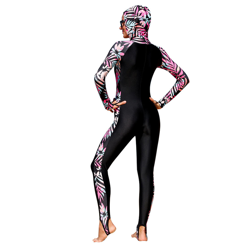 ชุดว่ายน้ำวันพีซมีฮู้ดพิมพ์ลายดิจิทัลสำหรับผู้หญิง พร้อมบราเสริมฟองน้ำแบบถอดได้ ป้องกันแสงแดด UPF50+ ผลิตจากผ้าสแปนเด็กซ์/โพลีเอสเตอร์ แห้งเร็ว
