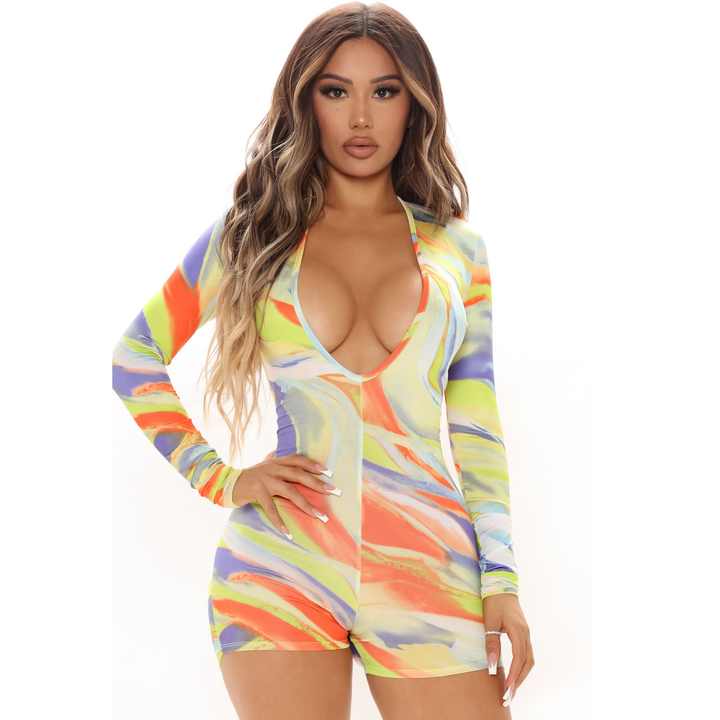 จั๊มสูทขาสั้นคอวีลึกสำหรับผู้หญิง,ชุดบอดี้สูทลายดอกไม้แขนยาวหนึ่งชิ้นชุดบอดี้สูทบอดี้คอนชุดหลวมคอวีโดยรวม