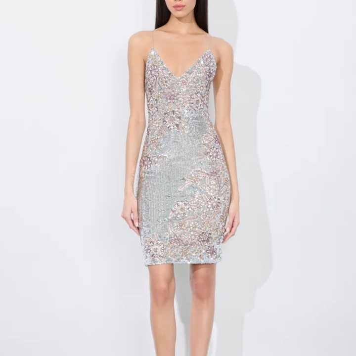 ชุดเดรสเลื่อมสีเงินแขนกุดเซ็กซี่สำหรับงานปาร์ตี้กลางคืน เปิดหลัง กระโปรงสั้น ขายดีสำหรับผู้หญิง