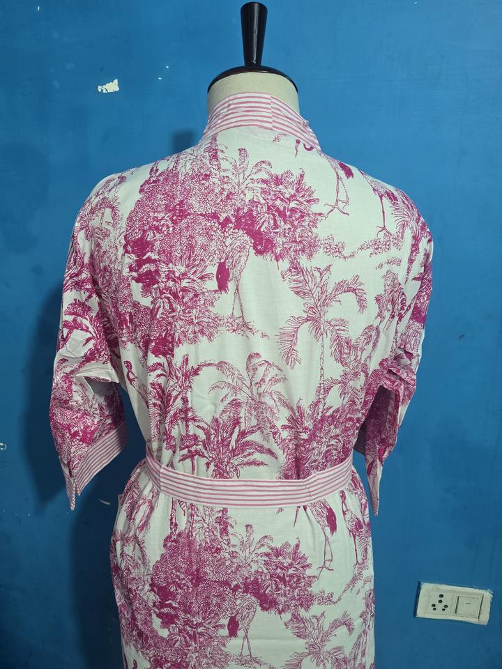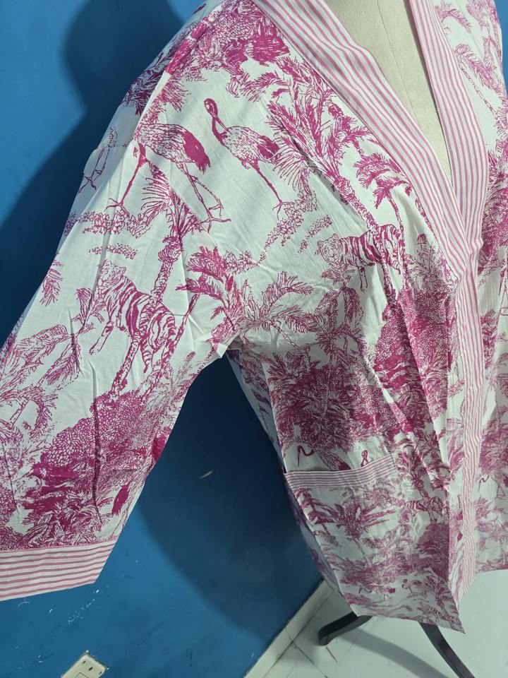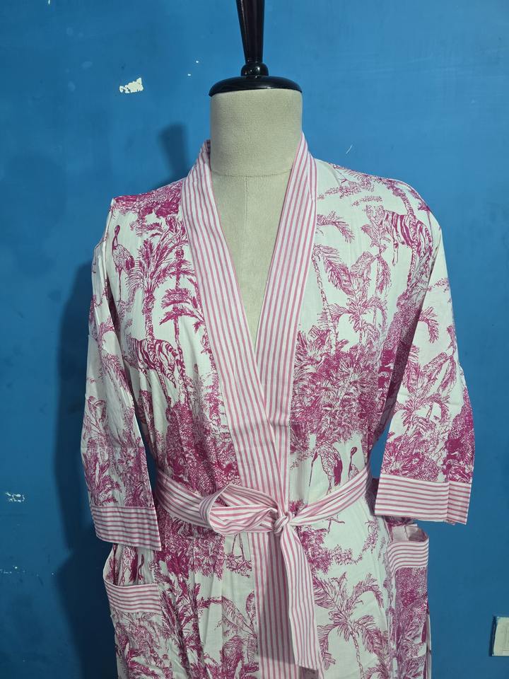 ชุดคลุมอาบน้ำคิโมโนลายป่าสีชมพูผ้าฝ้ายอินเดียสำหรับผู้หญิง เสื้อคลุมฤดูร้อนสวยงามสำหรับสปา ชายหาด ของขวัญวันวาเลนไทน์ ชุดคลุมชายหาด