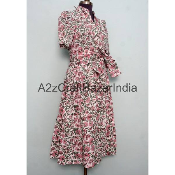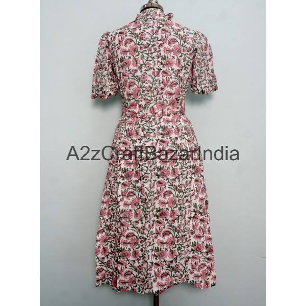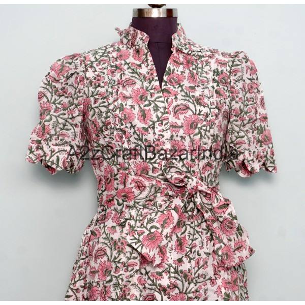 เดรสผู้หญิงสไตล์อินเดีย ทำมือ ทันสมัย ผ้าฝ้ายถักลายดอกไม้ 100% ทรงเอไลน์ ความยาวปานกลาง คอวี แขนสั้น มีกระเป๋า ติดกระดุม