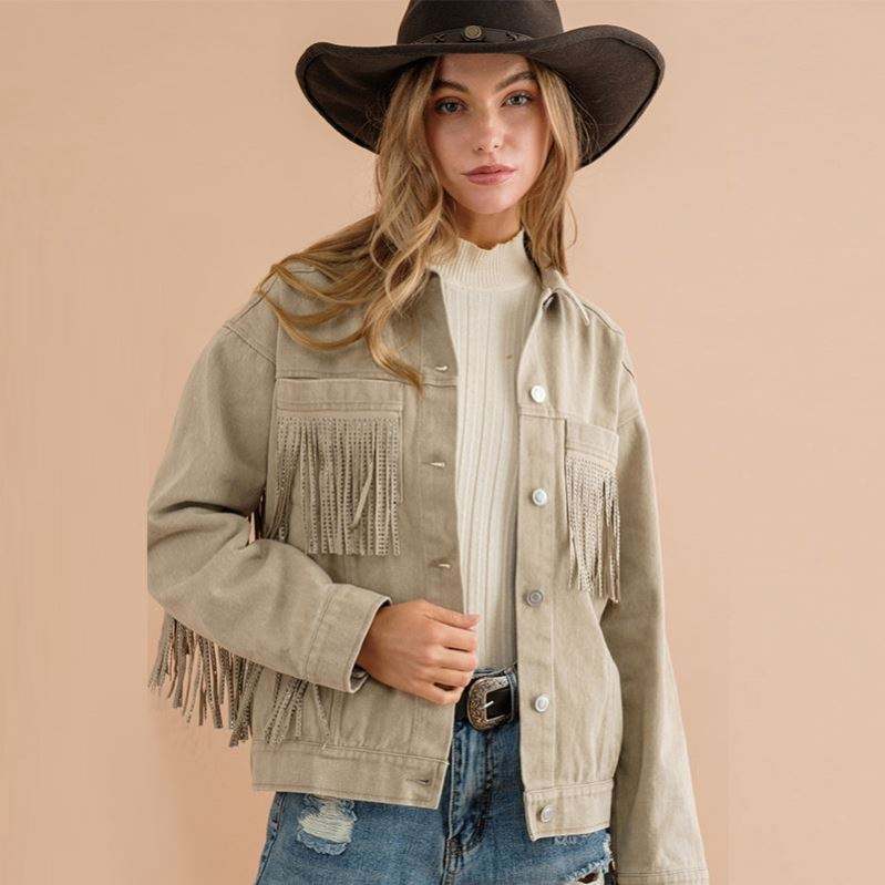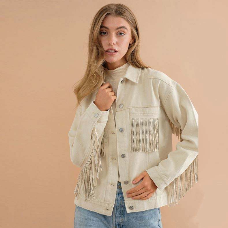 แจ็คเก็ตยีนส์ผู้หญิง แต่งพู่ สไตล์สตรีทแวร์ ลำลอง วินเทจ ฟอกสี ขาดๆ แนวไฮสตรีท สีขาว สีดำ