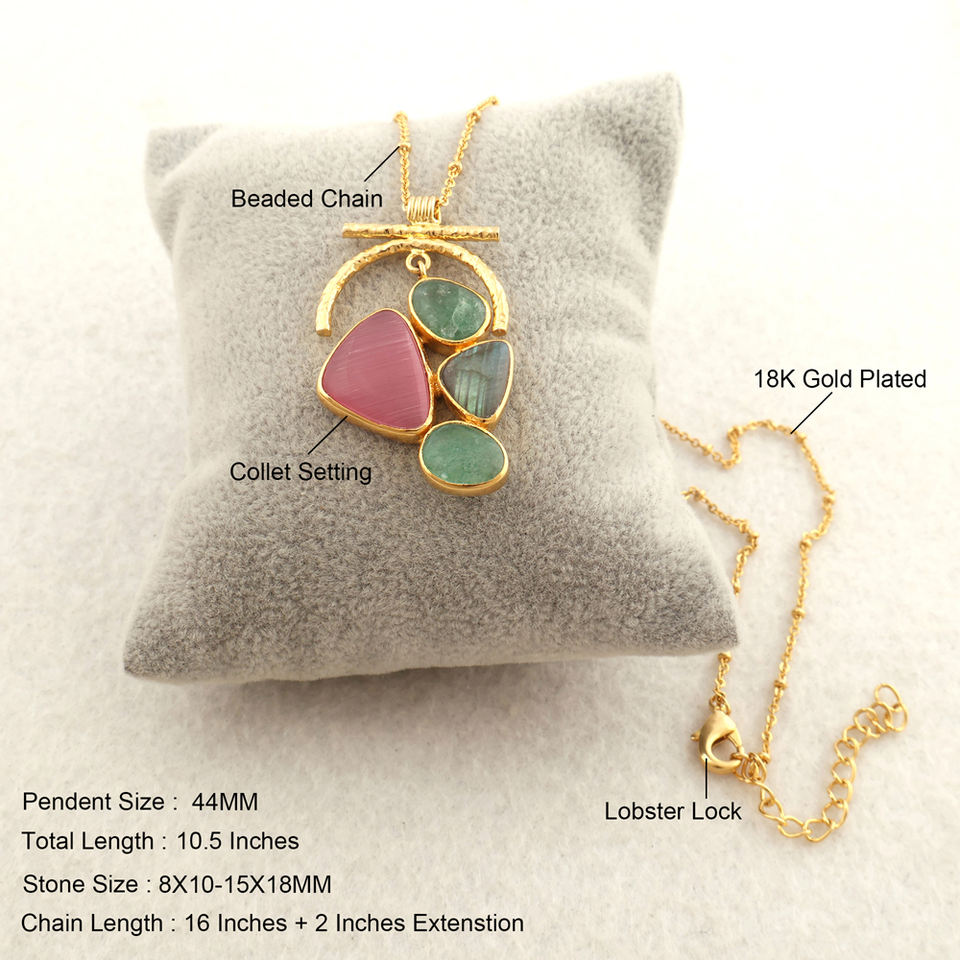 Women's Jewelry Real Labradorite, Monalisa & Green Strawberry Quartz Pendant Necklace 18k Gold Plated Crescent Hanging Necklace