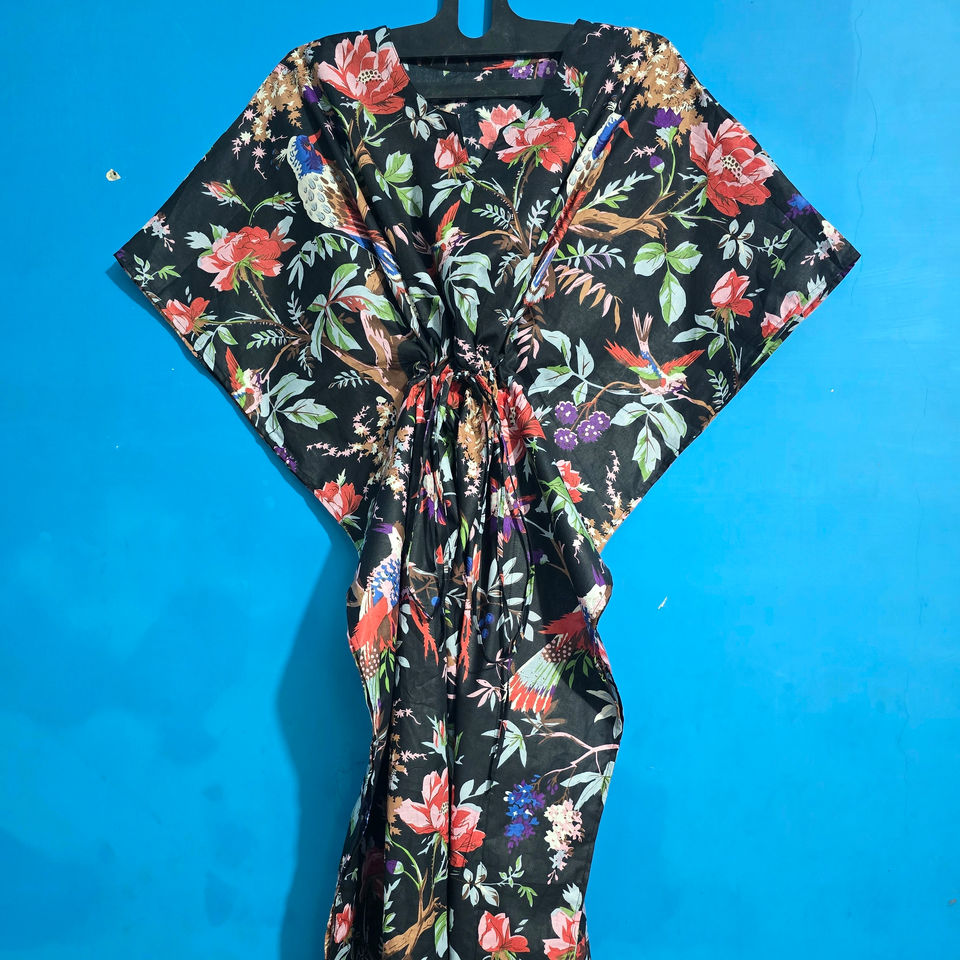 ชุดคลุมยาวสไตล์อินเดียสำหรับผู้หญิง ผ้าฝ้ายพิมพ์ลายดอกไม้และนกสีดำ ชุดคลุมชายหาด ชุดนอน คิโมโน คอวี พร้อมเข็มขัด ซักได้ เหมาะสำหรับฤดูร้อน