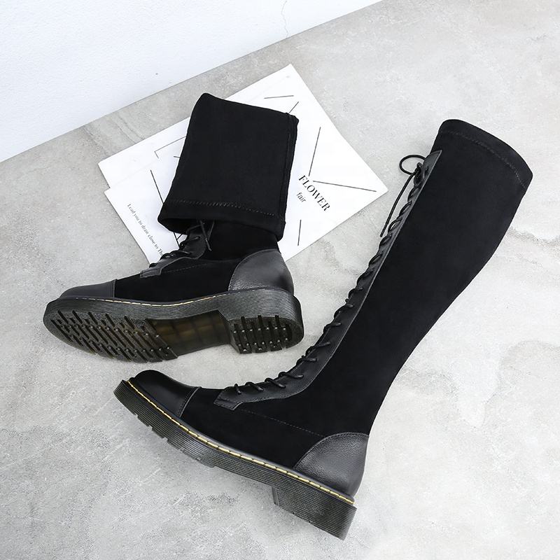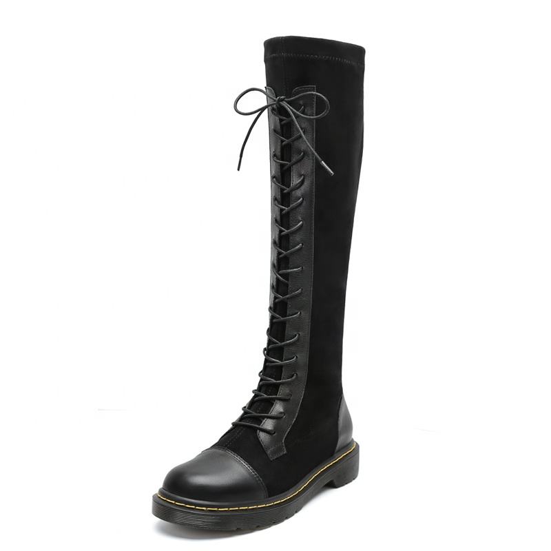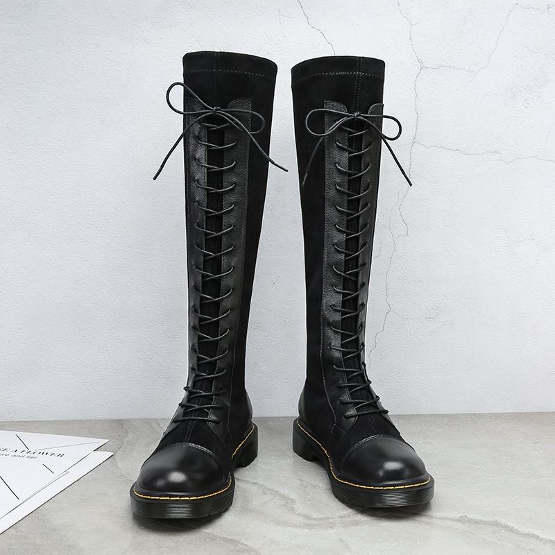 รองเท้าบูทหนังวัวกลับแบบสูงถึงเข่าสำหรับผู้หญิง ดีไซน์ผูกเชือกแบบยืดหยุ่น สวมใส่สบาย ทนทานต่อการสึกหรอ พื้นกันลื่น สีดำ สำหรับฤดูใบไม้ร่วง