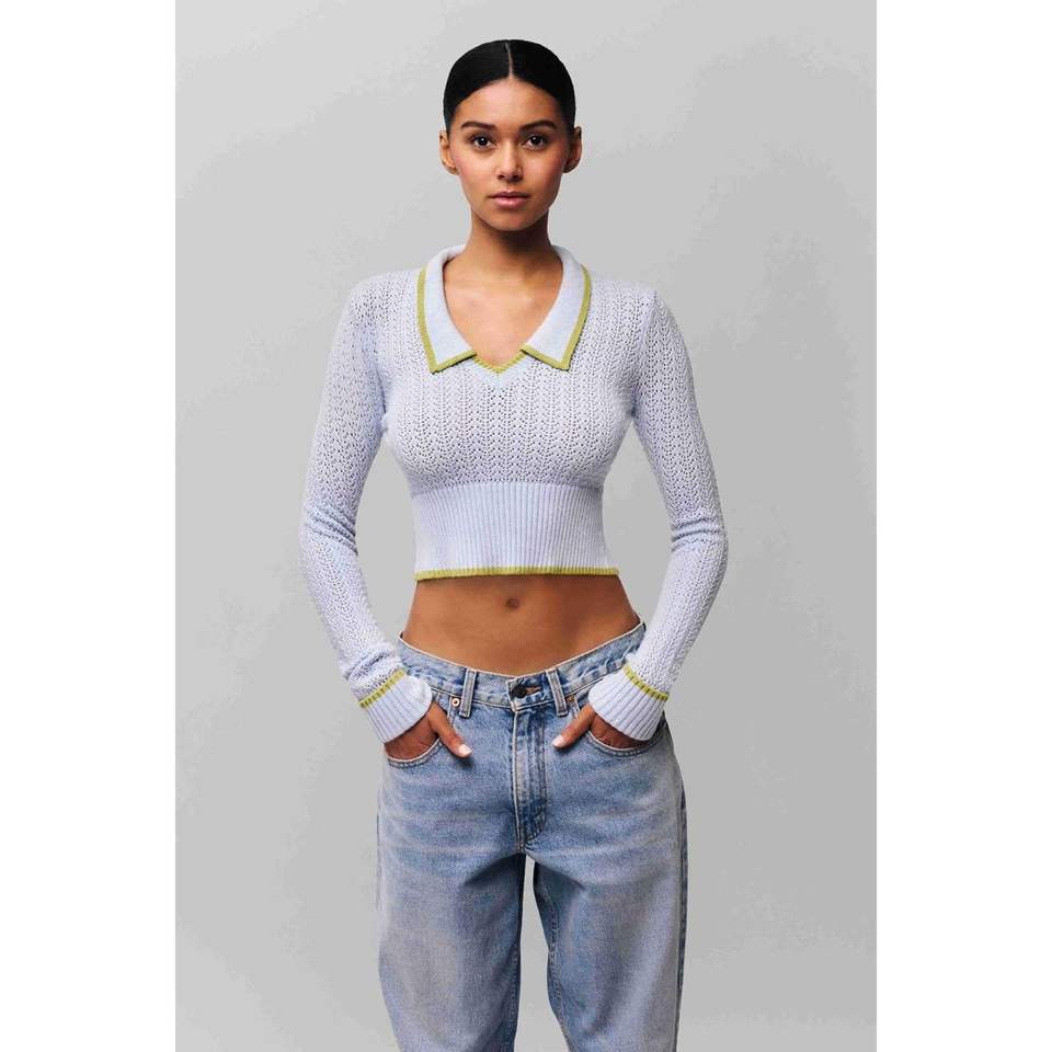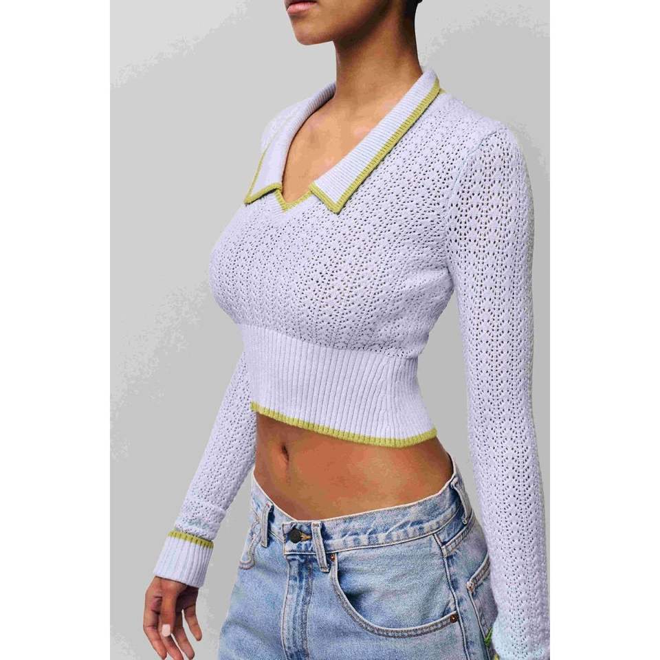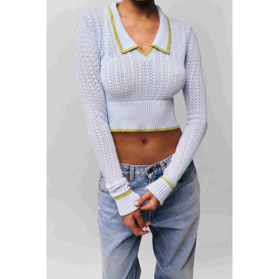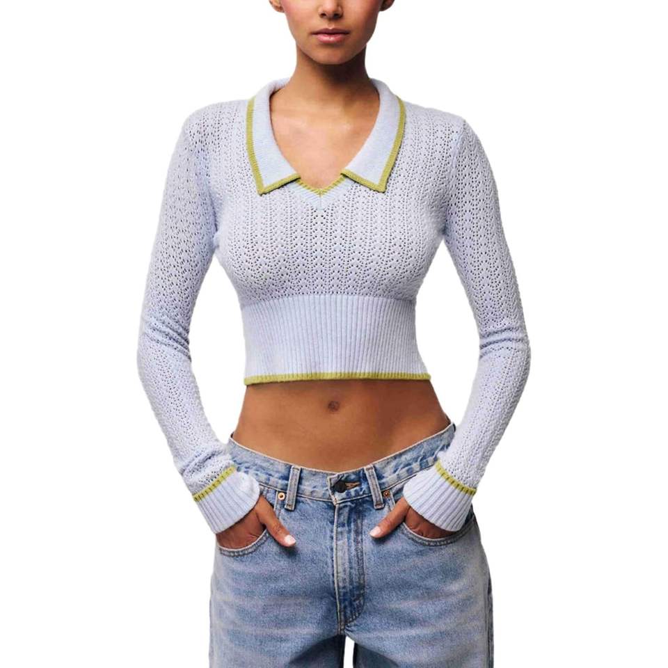เสื้อครอปถักสำหรับผู้หญิง แขนยาว คอวี คัลเลอร์บล็อค ผ้าเนื้อนุ่ม ความหนาปกติ แขนเสื้อแบบปกติ