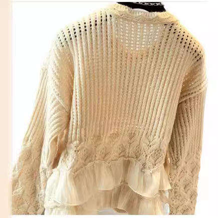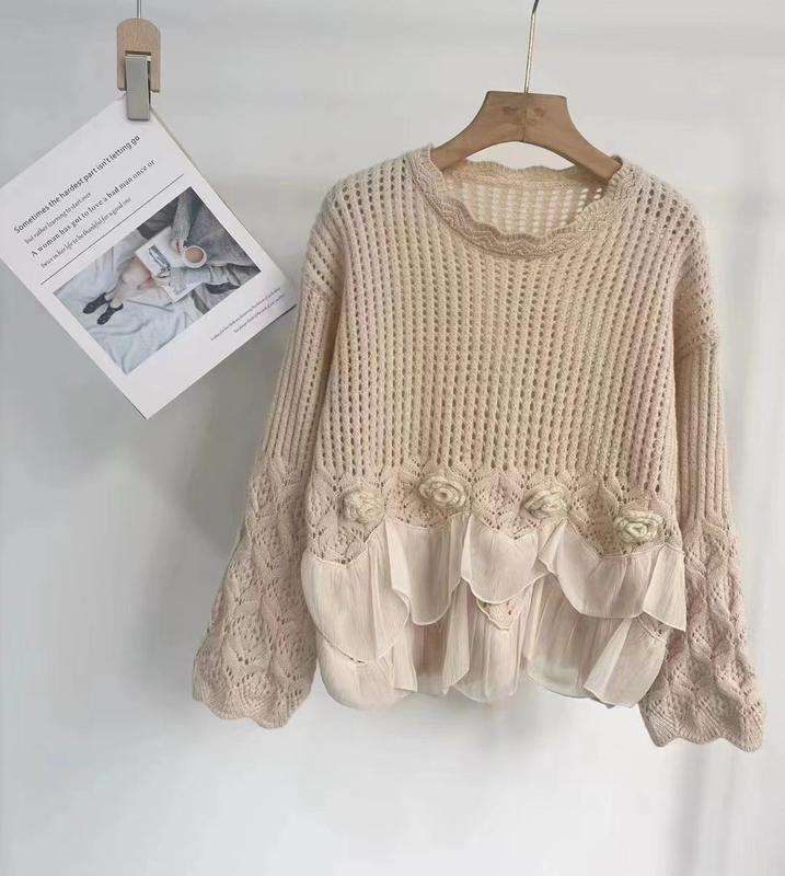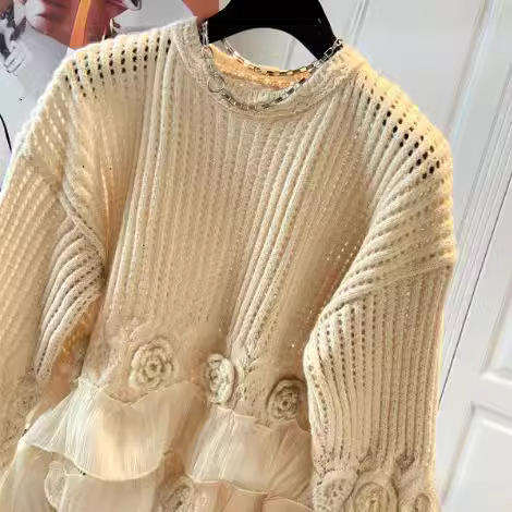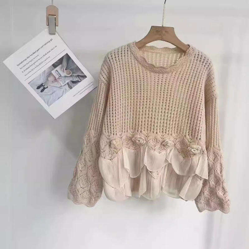 เสื้อสเวตเตอร์ถักสำหรับผู้หญิง ตกแต่งผ้าตาข่าย คอทรงกลม แต่งระบายชายเสื้อ ลายดอกไม้ 3 มิติ สไตล์ลำลอง ทรงหลวม แฟชั่น