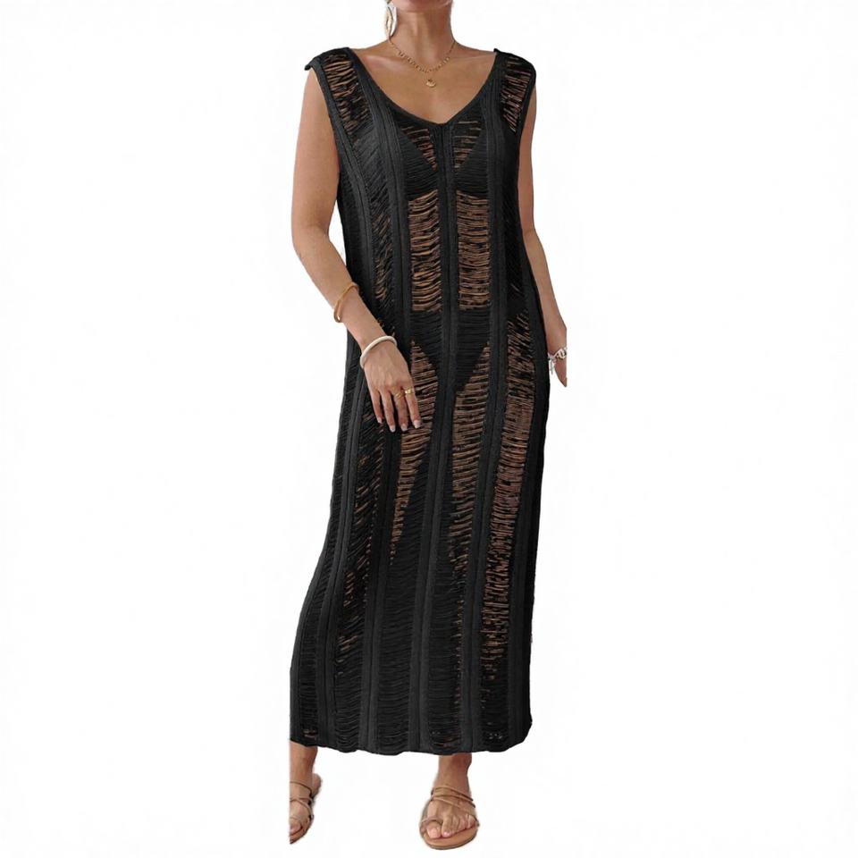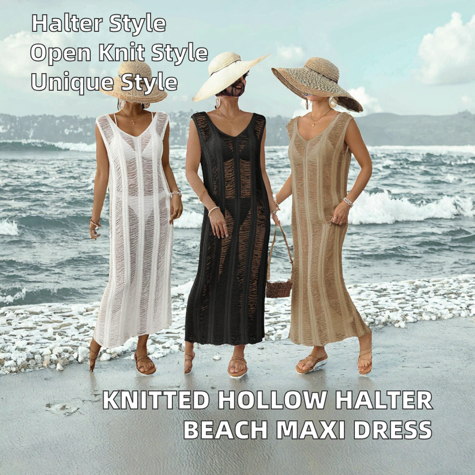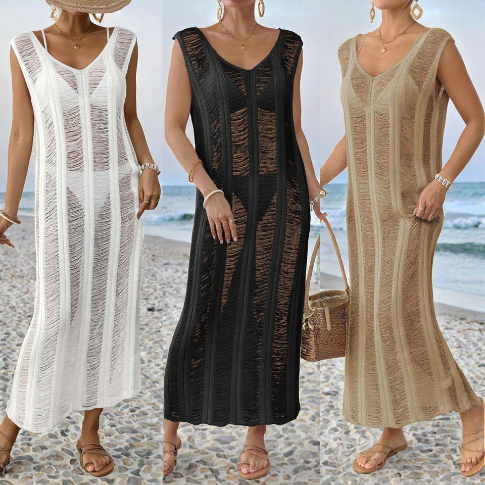 ชุดเดรสชายหาดไหมพรมถักสำหรับผู้หญิง แบบโปร่ง ระบายอากาศได้ดี คอสูง ไม่มีแขน ทรงยาว ชุดคลุมบิกินี่ตาข่าย รุ่นที่ 1