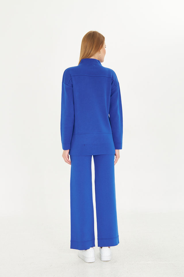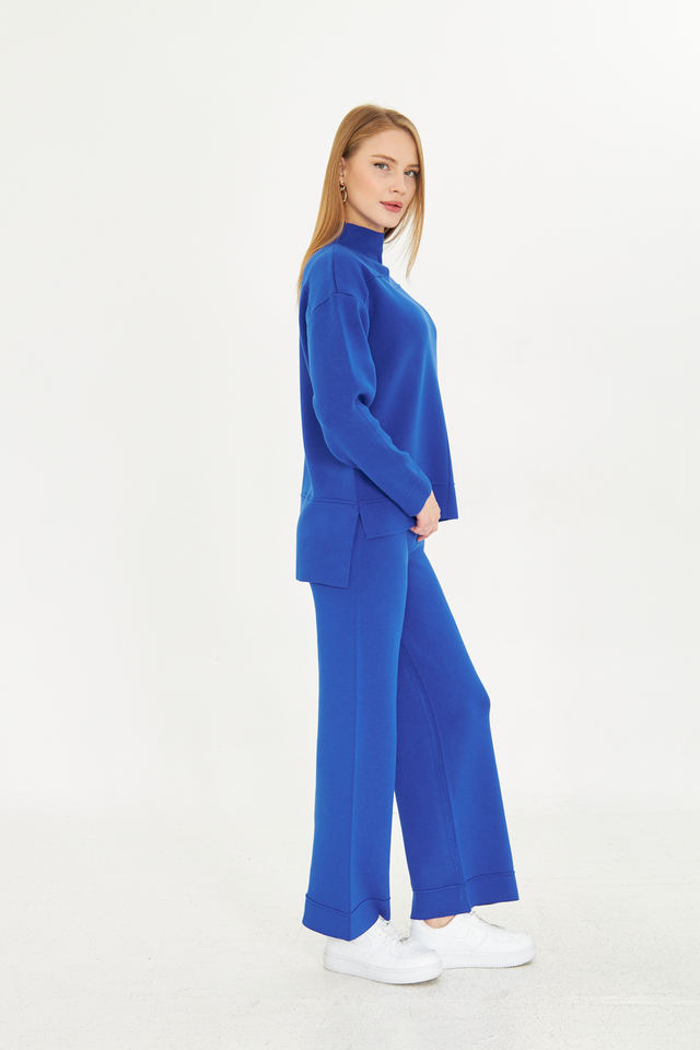 ชุดเสื้อสเวตเตอร์และกางเกง2ชิ้นสำหรับผู้หญิงชุดเสื้อถักแขนยาวเอวยางยืดชุดเสื้อถักขากว้างมีสไตล์