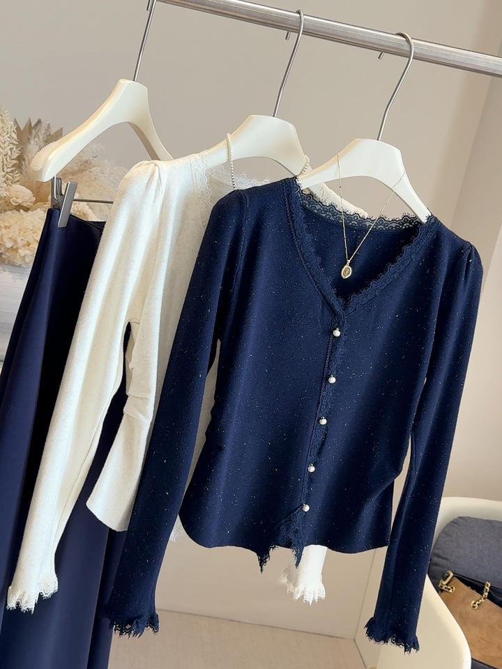 เสื้อสเวตเตอร์ถักคอวีล้วนแบบมีแผงลูกไม้สำหรับผู้หญิงแฟชั่น
