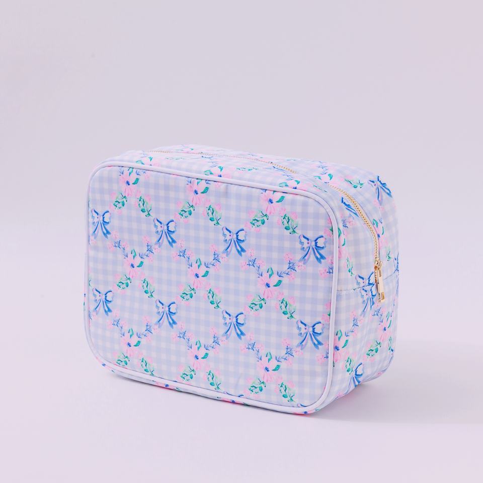 กระเป๋าเครื่องสำอางพิมพ์ลายโบว์สีฟ้าขนาดใหญ่สำหรับผู้หญิงกระเป๋าเครื่องสำอางไนลอนแบบ DIY กันน้ำมีซิปจัดระเบียบเครื่องสำอางสำหรับเดินทางสำหรับใส่ของใช้ในห้องน้ำขนาดใหญ่