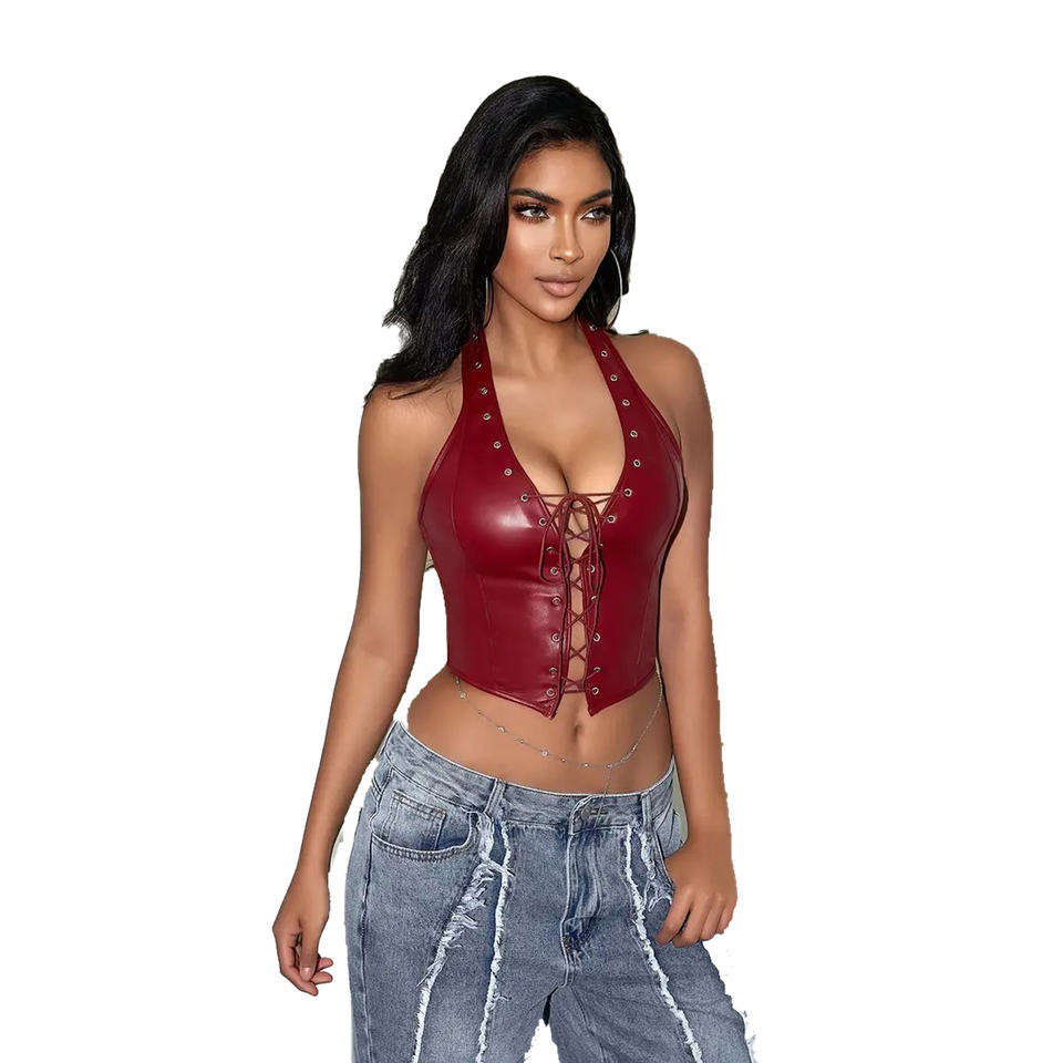 คอร์เซ็ทหนังผู้หญิง, เสื้อคอร์เซ็ทสายรัดคอวีเว้าลึกด้านหน้าปรับได้เข้ารูปแบบลำลองสวมใส่แบบรัดเอว