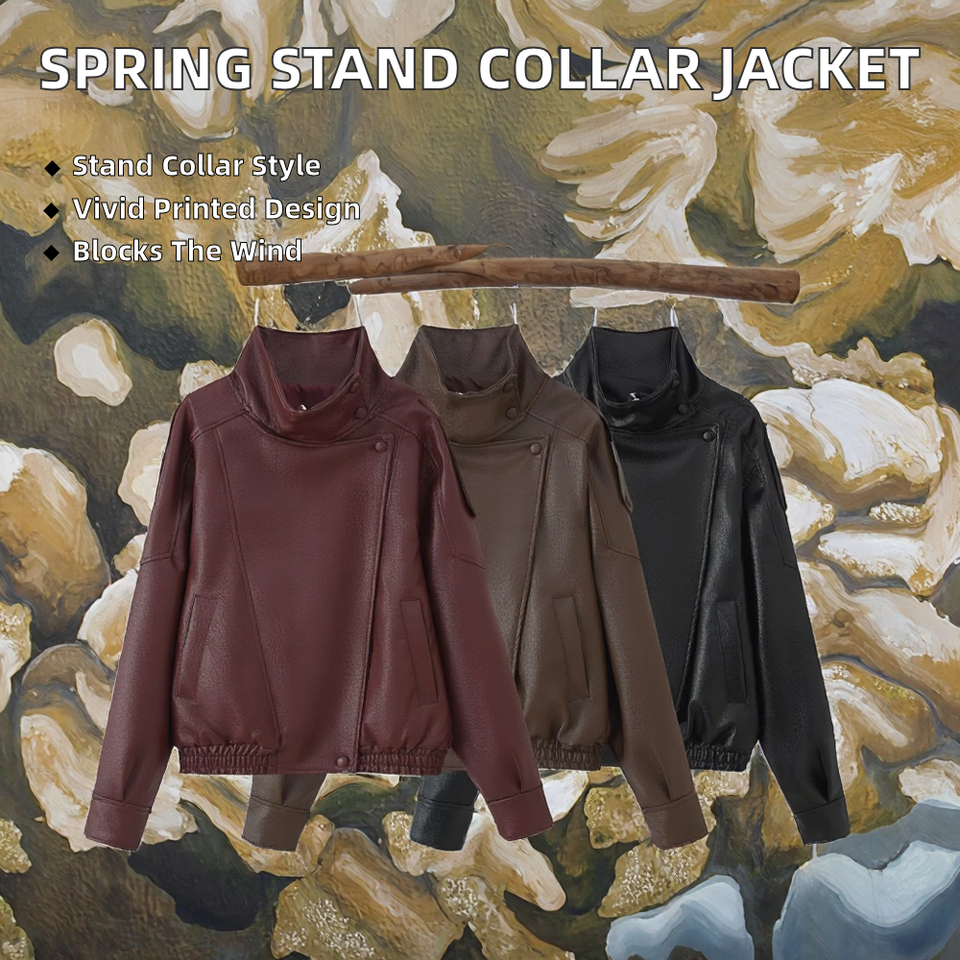 เสื้อแจ็คเก็ตหนังผู้หญิง คอลเลคชั่นฤดูใบไม้ผลิ 2026 แฟชั่นใหม่ ดีไซน์อเนกประสงค์ คอจีน แจ็คเก็ตบอมเบอร์ ซิปแบบเรียบง่าย ผลิตจากวัสดุรักษ์โลก