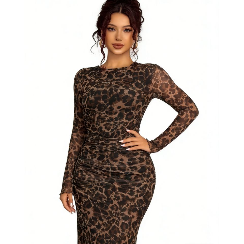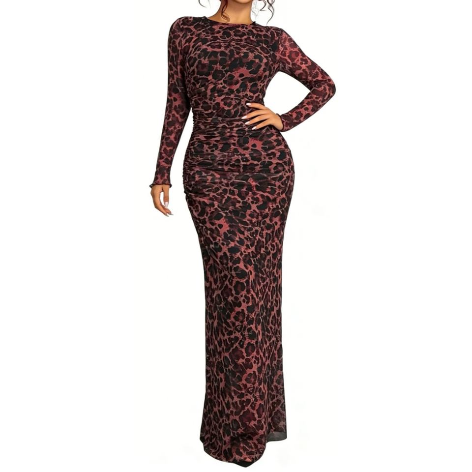 ชุดแม็กซี่เดรสแขนยาวรัดรูปพิมพ์ลายเสือดาว