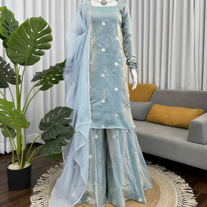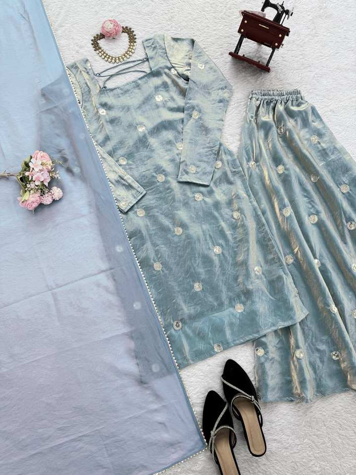 ชุดคุร์ตะผ้าไหมสีฟ้าอ่อนประดับเลื่อมสำหรับผู้หญิง พร้อมกางเกงปาลาซโซและผ้าคลุมไหล่
