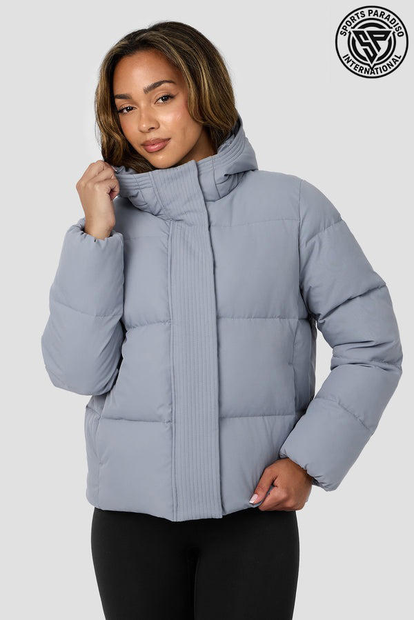 เสื้อแจ็กเก็ตขนเป็ดสีเทาอ่อนของผู้หญิงมีฮู้ดเสื้อคลุมกันหนาวบุผ้าให้ความอบอุ่น