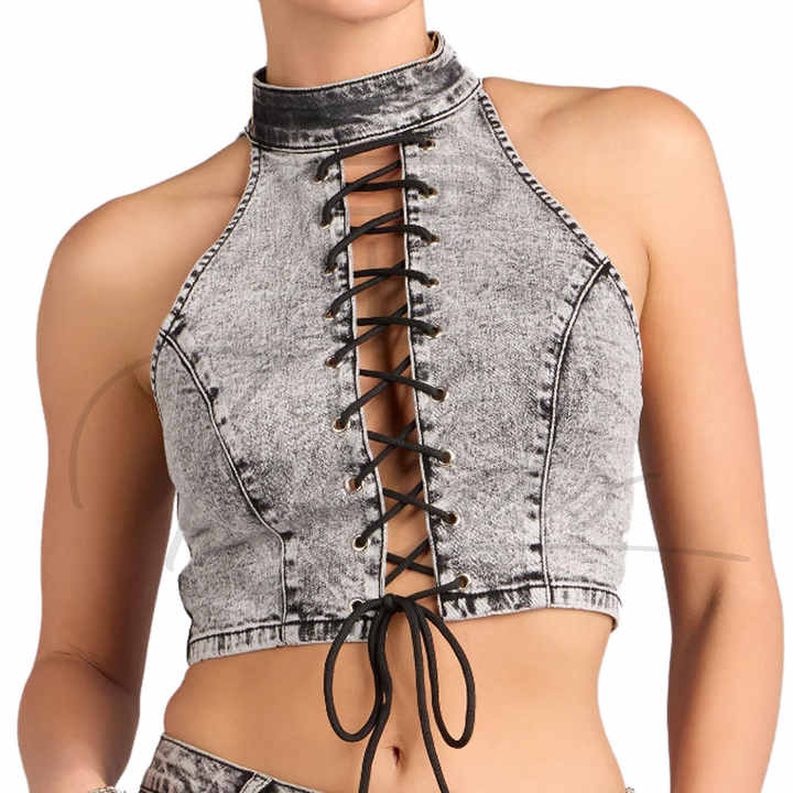เสื้อครอปยีนส์ผู้หญิงสีอ่อนทรงสลิมฟิตติดกระดุมด้านหน้าสำหรับฤดูร้อน ขายส่ง รับทำโลโก้ เสื้อครอปยีนส์ผู้หญิง