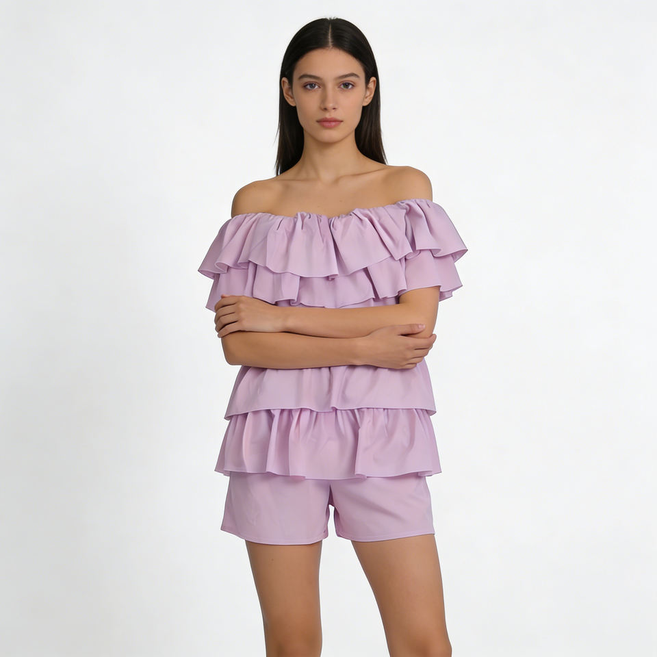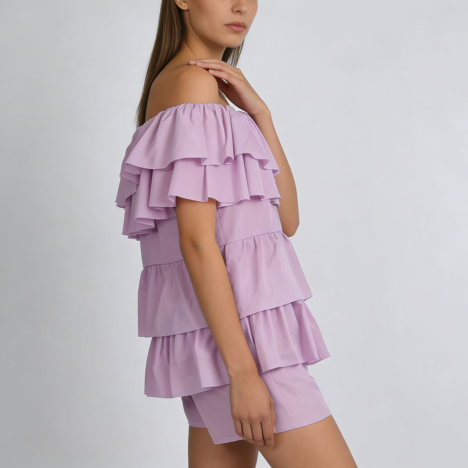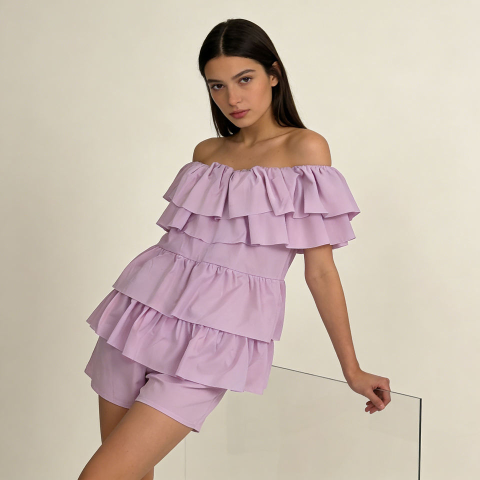 จั๊มพ์สูทขาสั้นแบบเปิดไหล่ แต่งระบายเป็นชั้นๆ รุ่น Flowy ปี 2026 เหมาะสำหรับงานลำลองกลางแจ้ง สำหรับสุภาพสตรี ขายดี