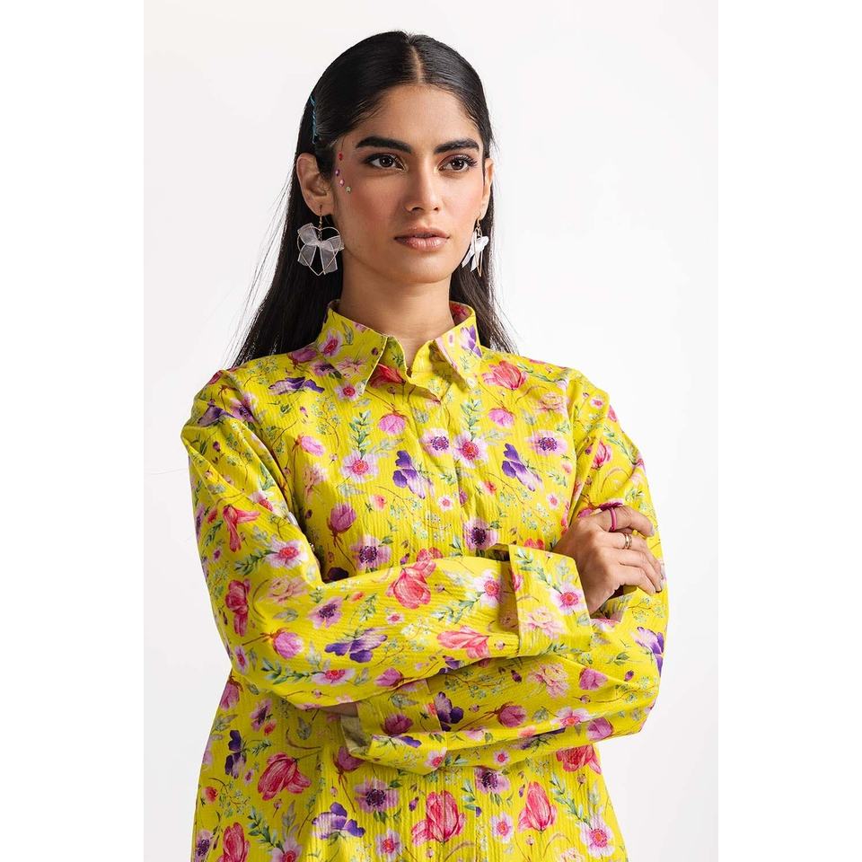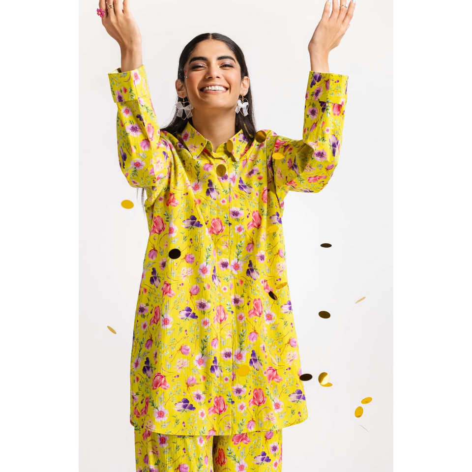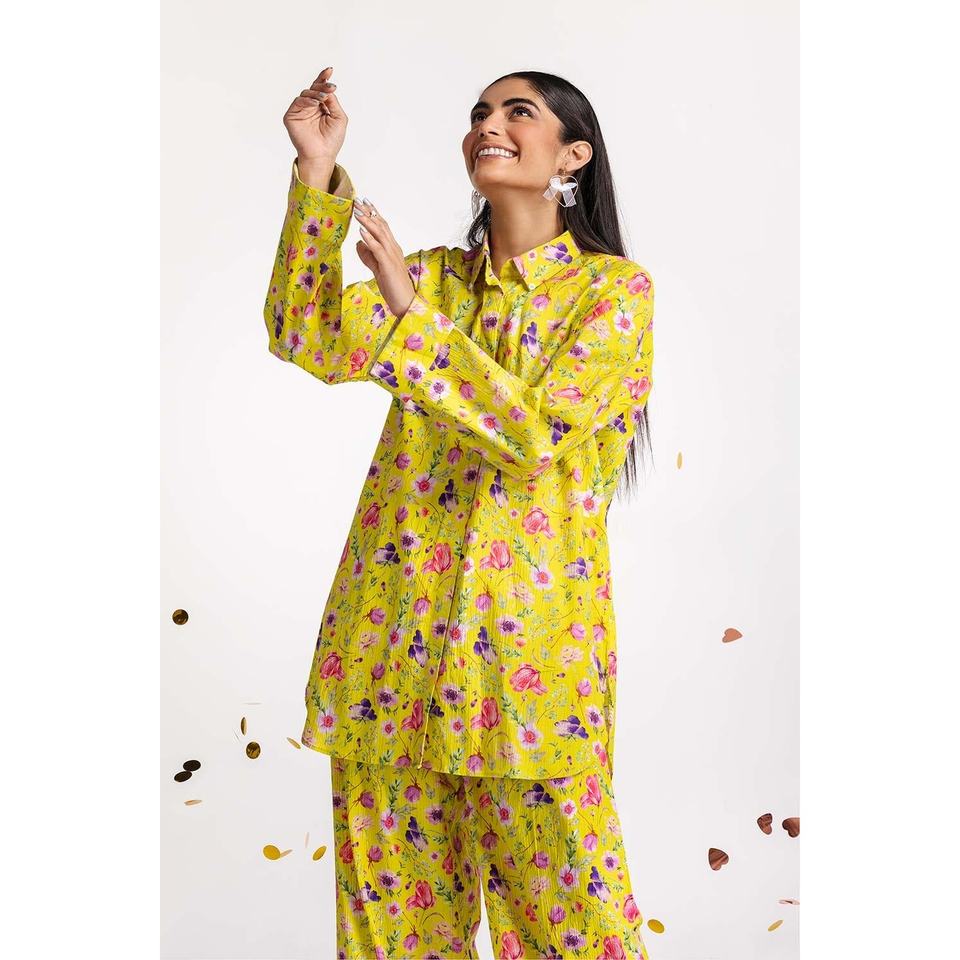 ชุดเซ็ตยีนส์พิมพ์ลายดิจิตอลสีเขียวมะนาวสำหรับผู้หญิง ผ้าไลคร่า 2 ชิ้น ไซส์ XXL เสื้อและกางเกงขาสั้นทรงสุภาพ เสื้อตัวสั้นและกางเกงขายาว