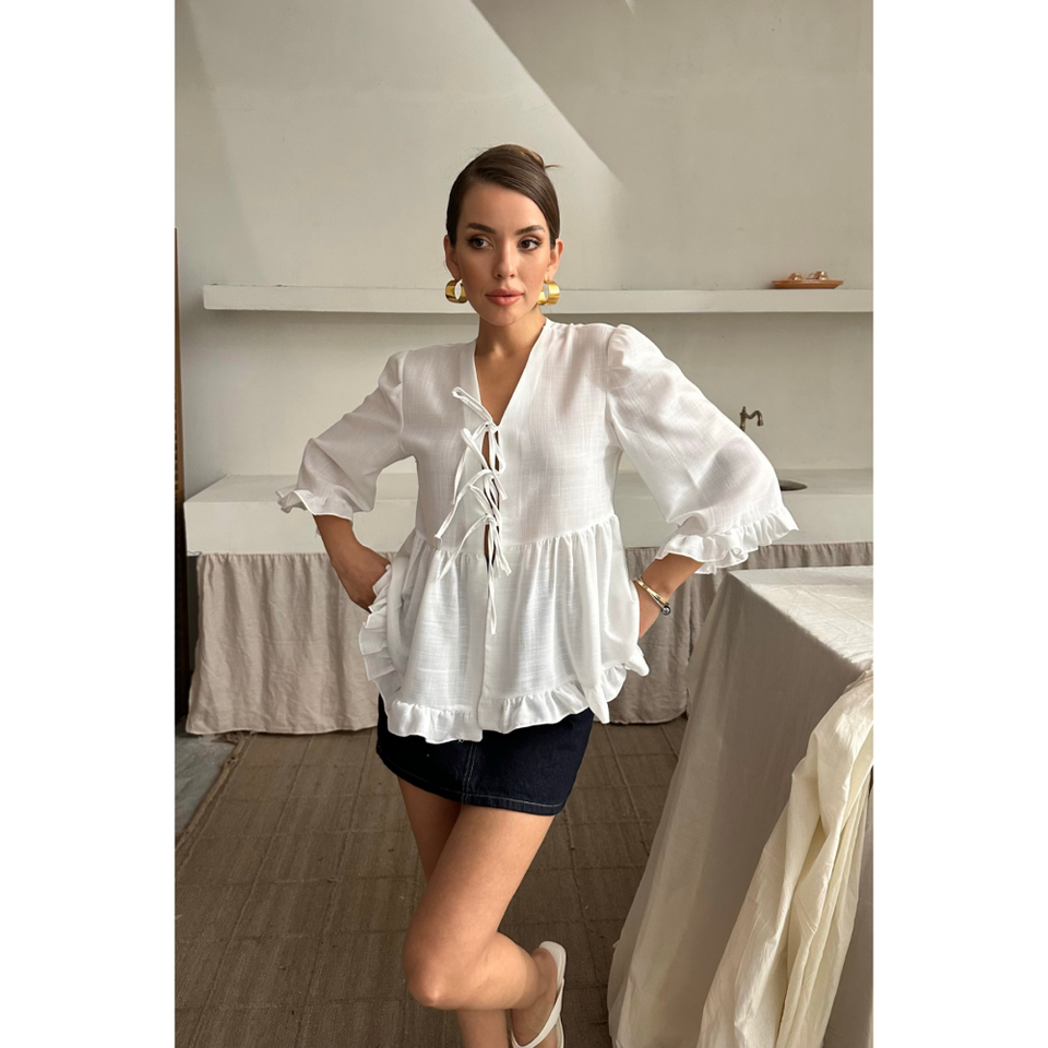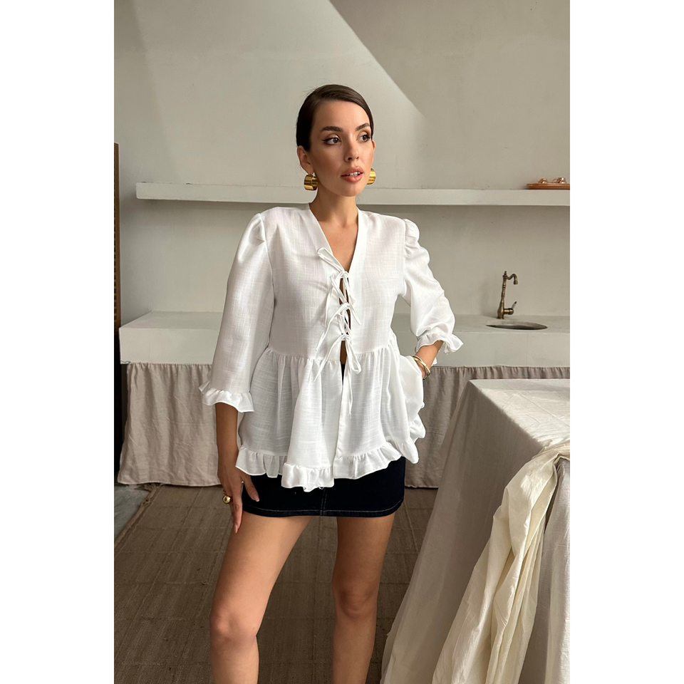 เสื้อเชิ้ตผ้าลินินผู้หญิงสีขาว แต่งระบายและผูกด้านหน้า