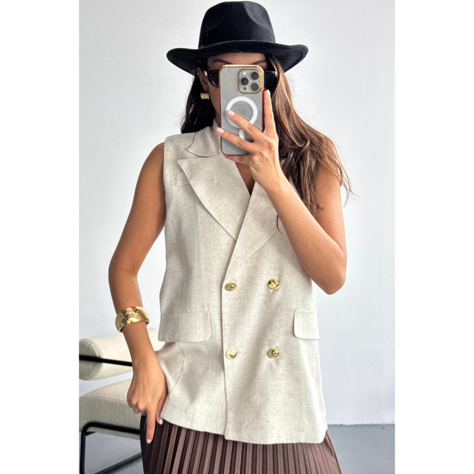 เสื้อกั๊กผ้าลินินสำหรับผู้หญิง พร้อมกระดุมทอง แบบดิบ