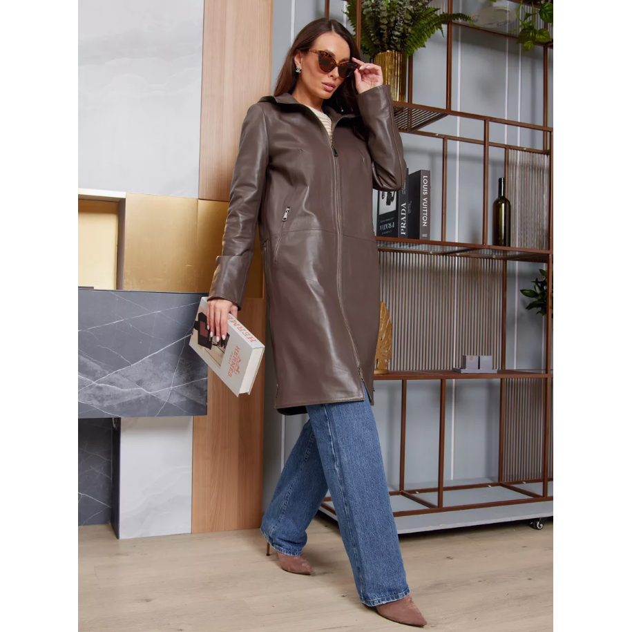 Women’s Long Brown Leather Coat – Genuine Lambskin, Tailored Fit, Streamlined Finish