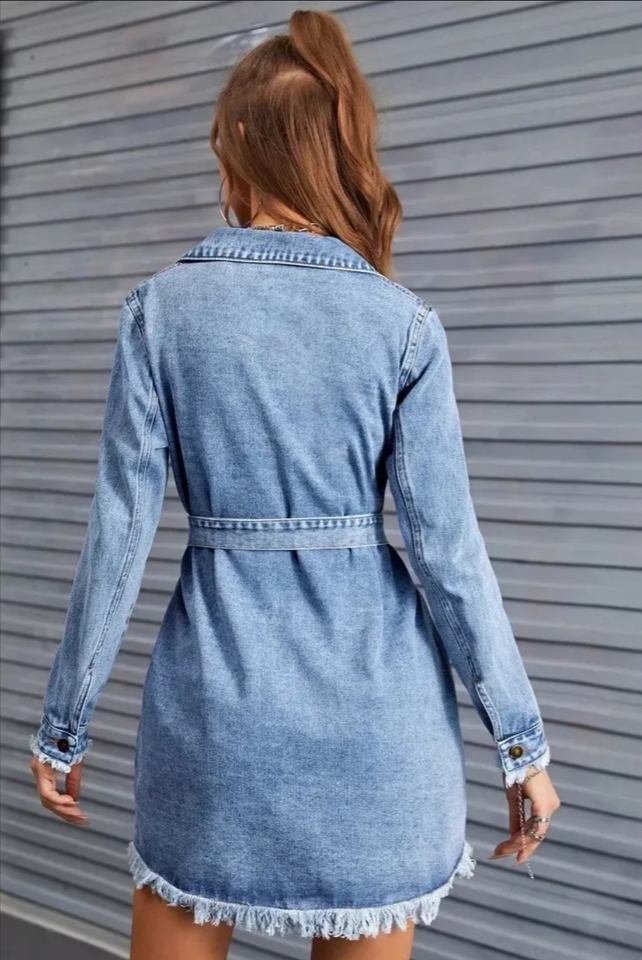 ชุดเดรสเชิ้ตยีนส์แขนยาวติดกระดุมสำหรับผู้หญิงพร้อมชายเสื้อแบบรุ่ย