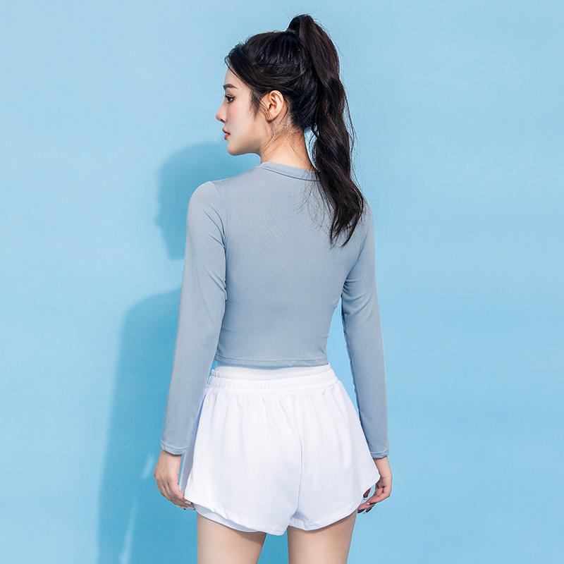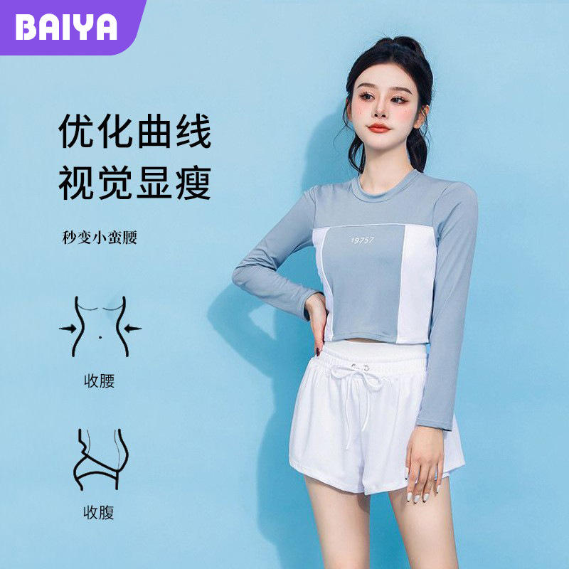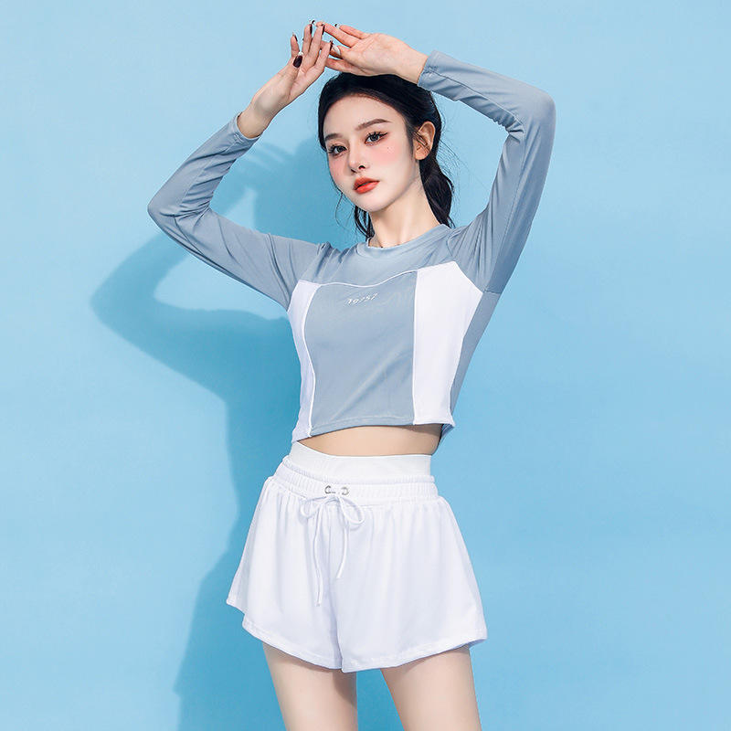 ชุดว่ายน้ำแขนยาวสองชิ้นสำหรับผู้หญิง สีฟ้าทะเลสาบและสีดำ UPF50 พลัส ชุดว่ายน้ำสไตล์สปอร์ตสำหรับวันหยุดและการออกกำลังกาย