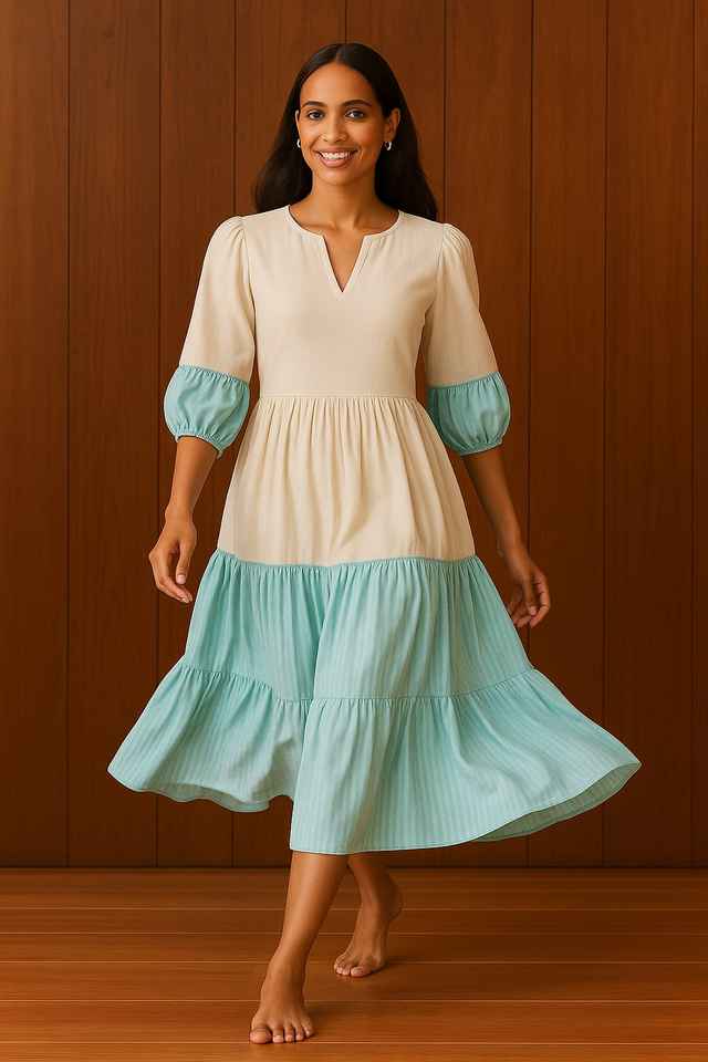เดรสผ้าฝ้ายสีเบจ-น้ำเงินแบบหลวมสำหรับผู้หญิง แขนพอง คอวี ดีไซน์ทรงเอไลน์แบบมีชั้น ชุดลำลองสำหรับฤดูร้อน
