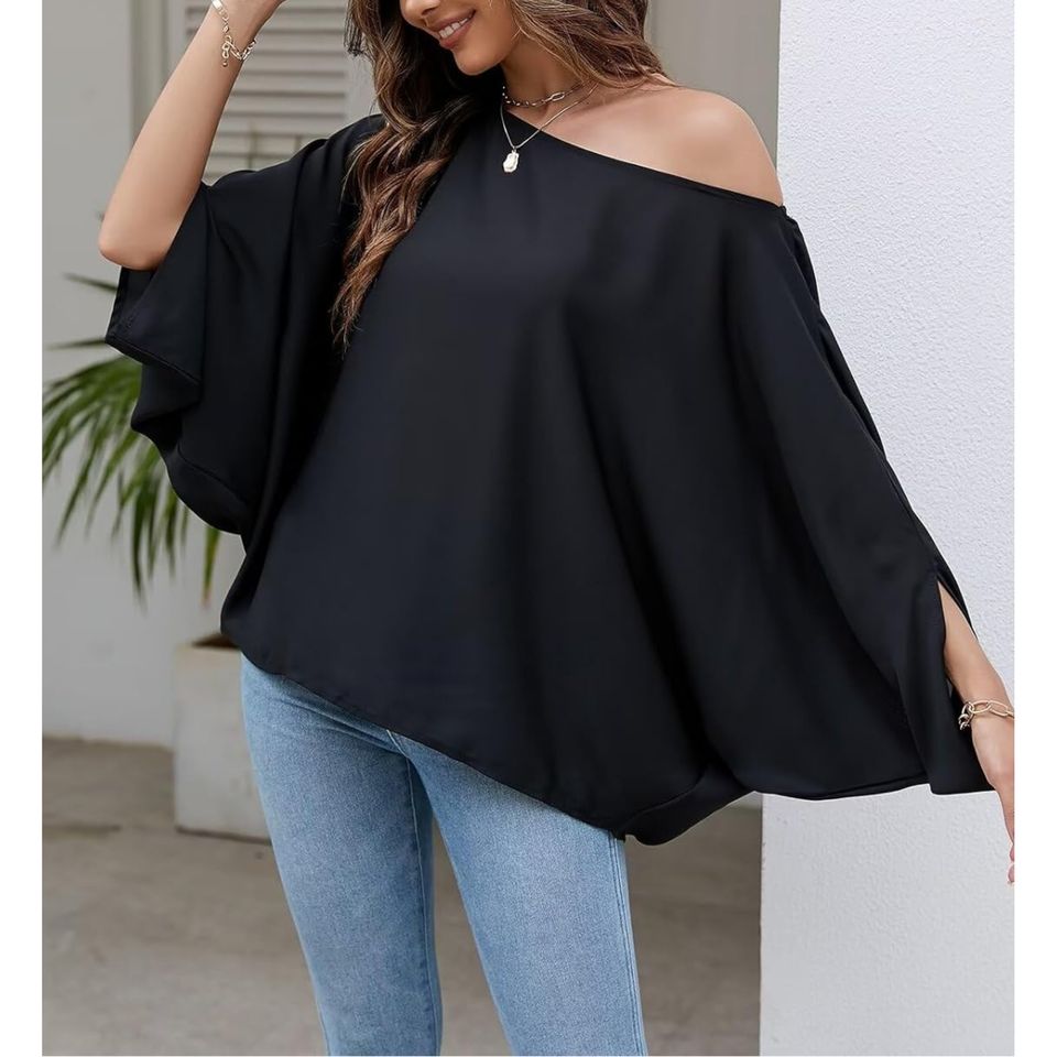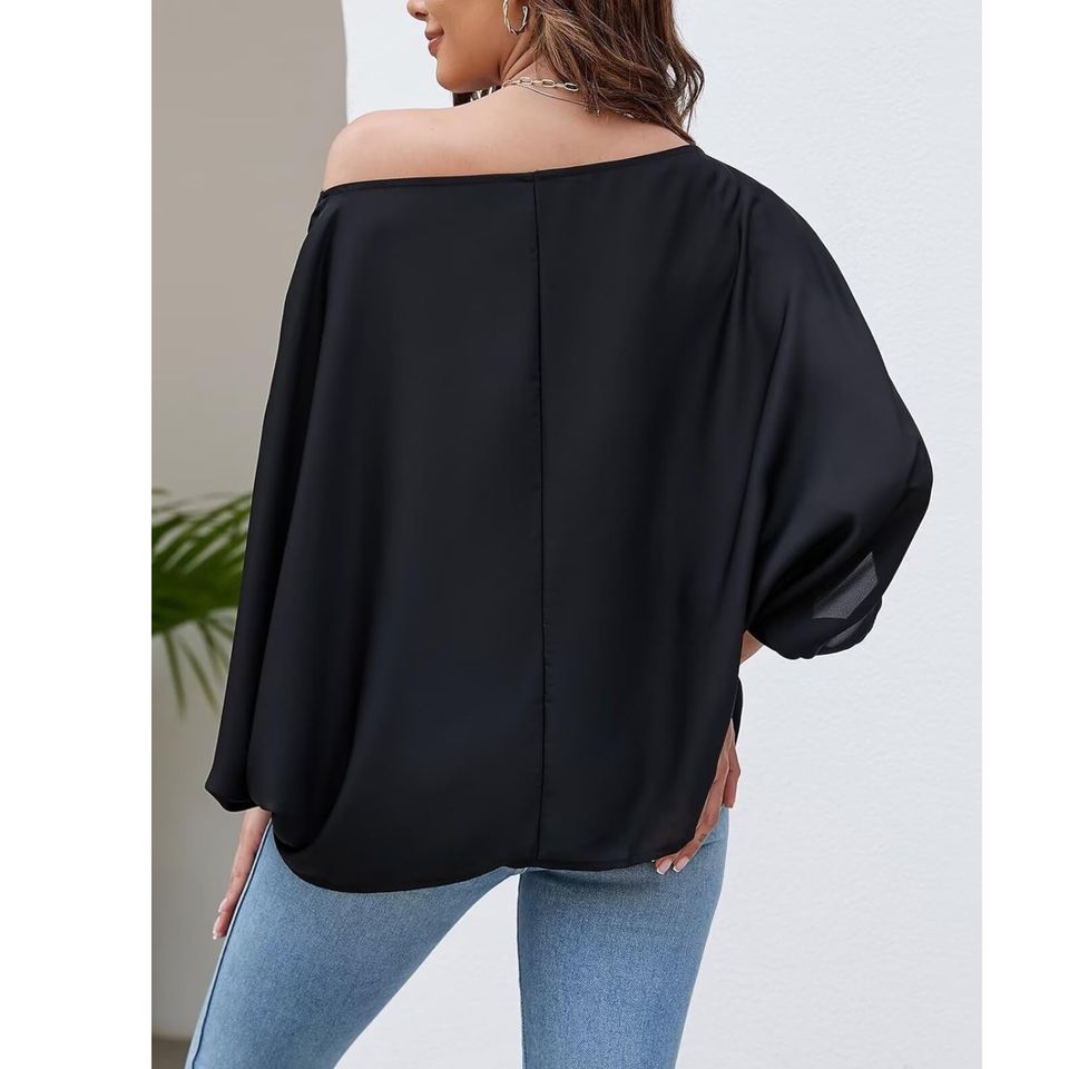 เสื้อเบลาส์ผ้าชีฟองทรงหลวมของผู้หญิงตกแต่งด้วยลูกไม้ปักลายเสื้อโชว์ไหล่แขนทรงปีกค้างคาวลำลองสำหรับฤดูใบไม้ผลิ