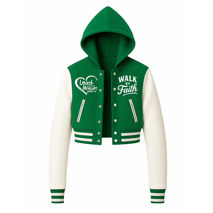 แจ็คเก็ตสตรี "รักเกินกว่าวัดเดินโดยศรัทธา" เสื้อครอปตัวแทน-เครื่องบินทิ้งระเบิดมีฮู้ดสีเขียวและสีขาวสำหรับใส่คริสเตียน