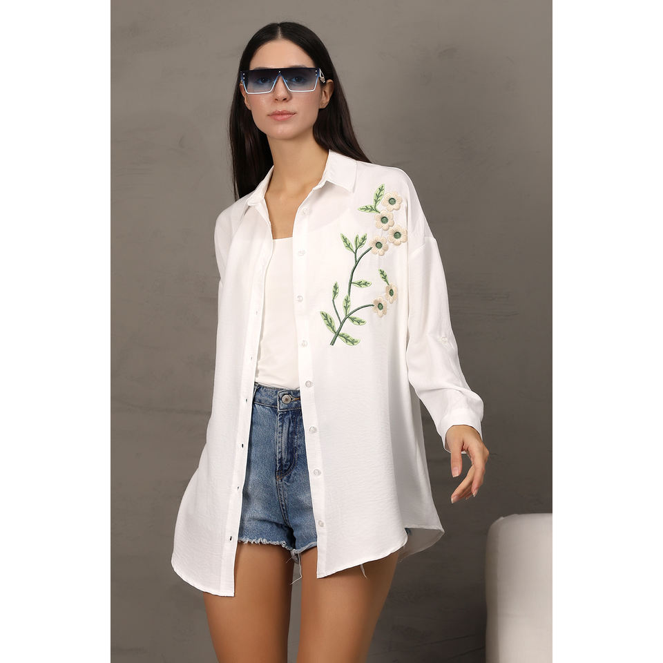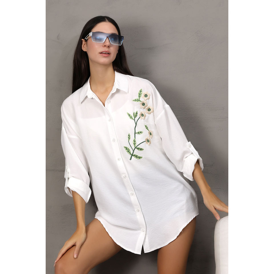 Women's Low Sleeve Oversize Ayrobin White Shirt with 6 Flower Embroidery Sizes S-M-L-XL Available