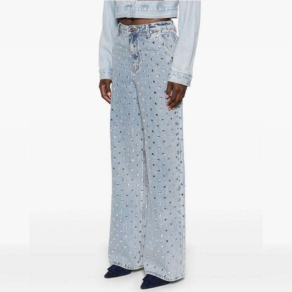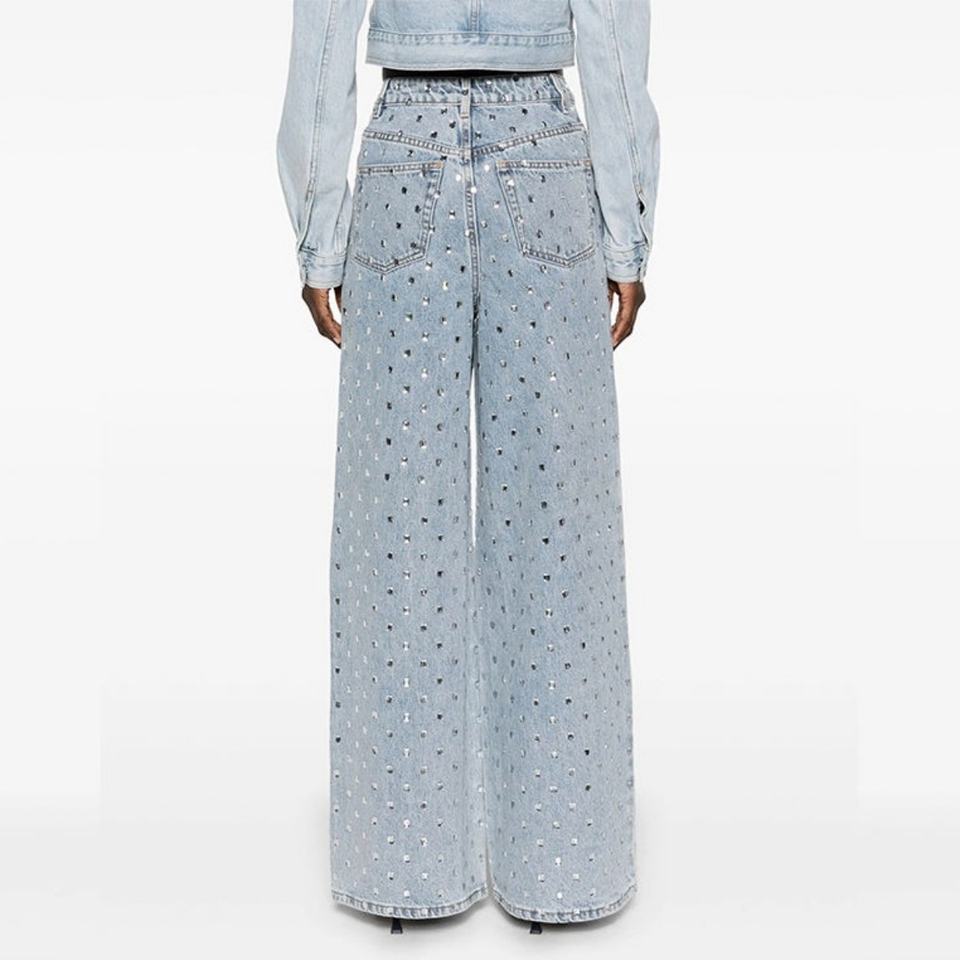 กางเกงยีนส์เอวต่ำทรงตรงหลวมสไตล์วินเทจ ล้างสีเดนิม ประดับคริสตัลเต็มตัว เซ็กซี่ สตรีทแวร์