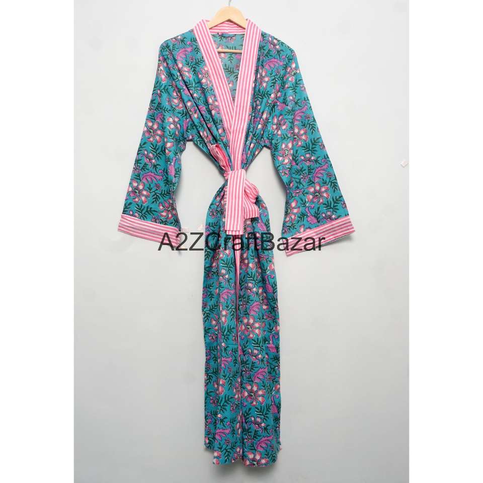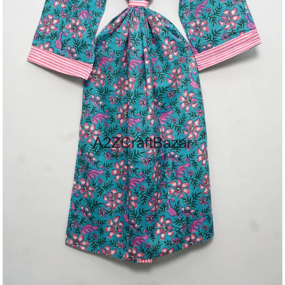 ชุดคลุมยาวสำหรับผู้หญิง ผ้าฝ้ายแท้ 100% พิมพ์ลายด้วยมือ คอวี แขนสามส่วน ปิดด้วยเชือกผูก ลายดอกไม้ด้านหน้า