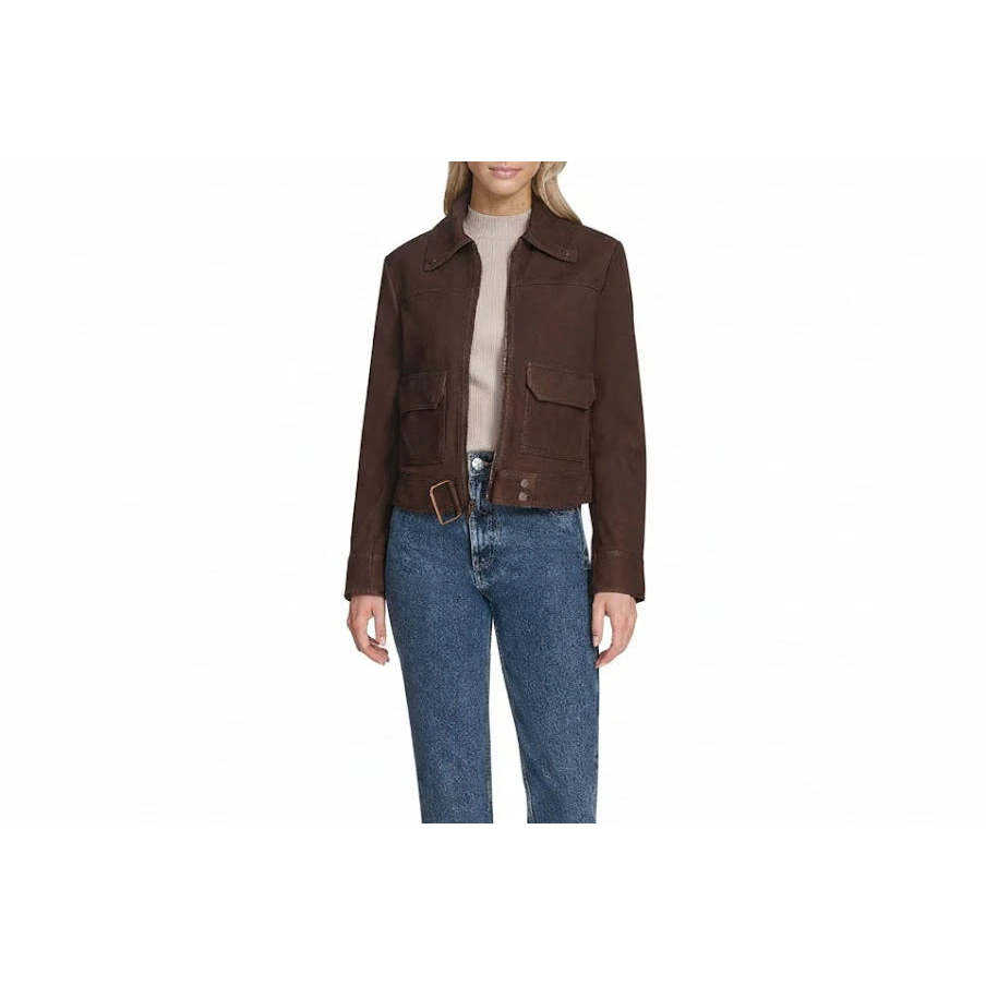แจ็คเก็ตหนังแกะสีน้ำตาลสั้นสำหรับผู้หญิง ไซส์ XS ผลิตจากหนังกลับกันลมอย่างดี