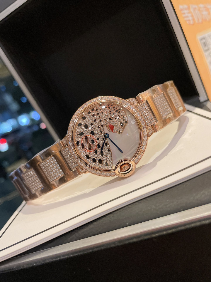 นาฬิกาข้อมือผู้หญิงหรูหรา ประดับเพชรเต็มหน้าปัด ลายเสือดาว สายโลหะสีเงิน พร้อมมงกุฎลายเซ็น ดีไซน์สง่างาม เหมาะสำหรับใส่กับชุดเดรส