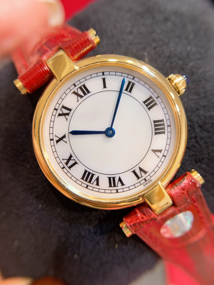 นาฬิกาข้อมือสตรีสีทองหรูหราสายหนังจระเข้สีแดงหน้าปัดโรมันทำด้วยมือสีฟ้าทำจากสวิส