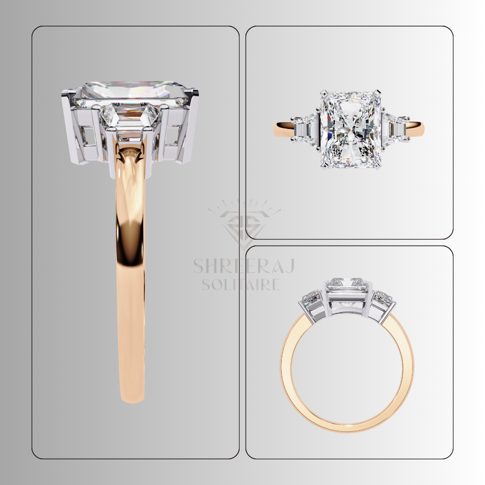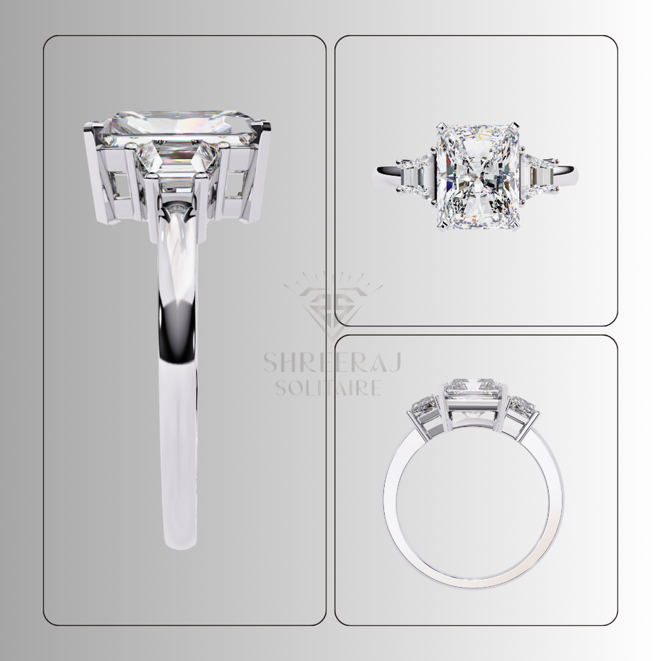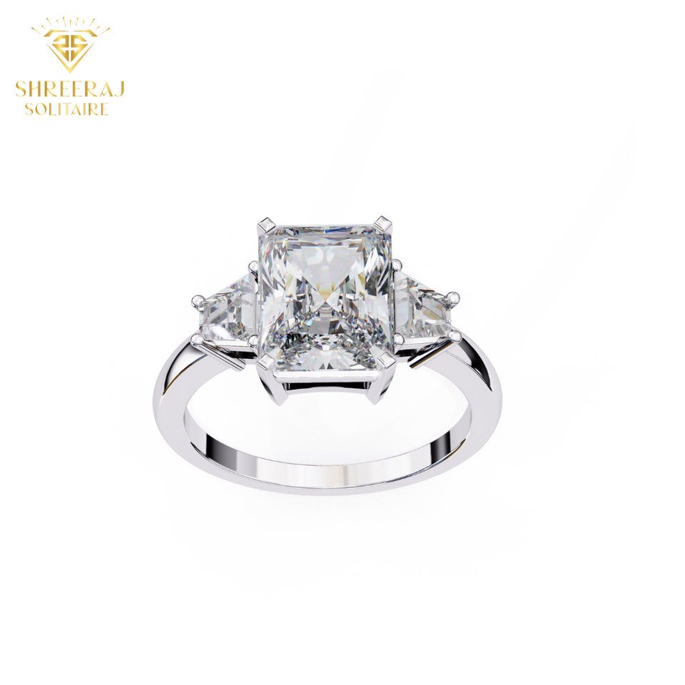 แหวนเพชรทรงคลาสสิกหรูหราสำหรับผู้หญิง เพชรเม็ดเดี่ยวทรงเรเดียนท์คัท 3 เม็ด น้ำหนักรวม 4.50 กะรัต ได้รับการรับรองจาก IGI เพชรเพาะเลี้ยงในห้องปฏิบัติการแบบ CVD ปรับแต่งได้