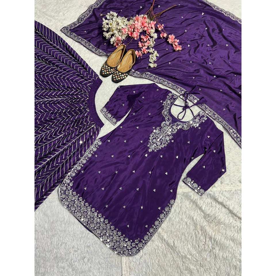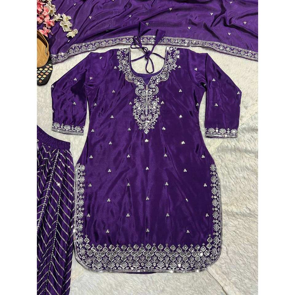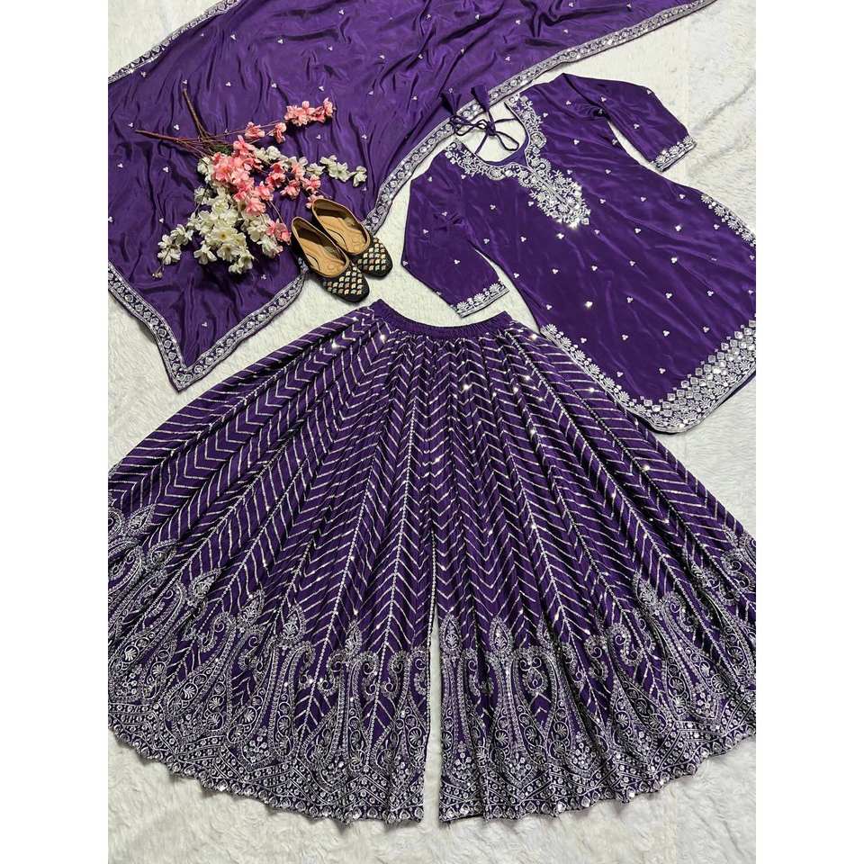 ชุดเสื้อผ้าผู้หญิง Maruti สีม่วงสวยงามสำหรับงานปาร์ตี้ ประกอบด้วยเสื้อ แพลลาซโซ และผ้าคลุมไหล่ พร้อมงานปัก ขนาด L น้ำหนัก 900 กรัม