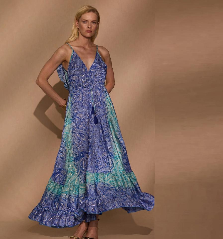 เดรสแม็กซี่สำหรับผู้หญิง ทรงโบโฮ แขนกุด คอวี เปิดหลัง ทรงพลิ้วไหว ชุดเดรสชายหาดฤดูร้อนแบบยาว แต่งระบายชายกระโปรง คละสี