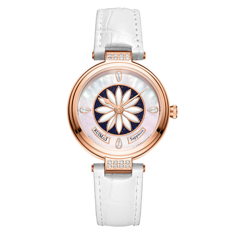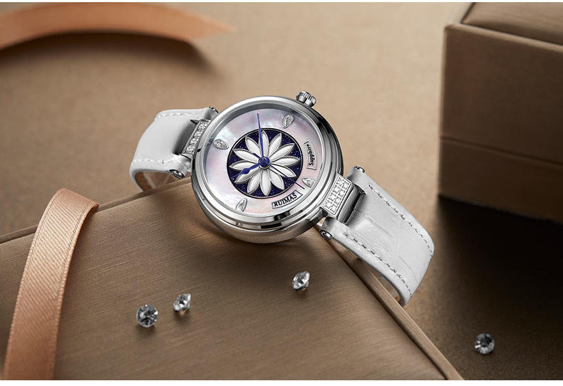 นาฬิกากลไกของผู้หญิงสว่างกันน้ำสายหนังแท้นาฬิกาข้อมือแฟชั่นแบบกลไก