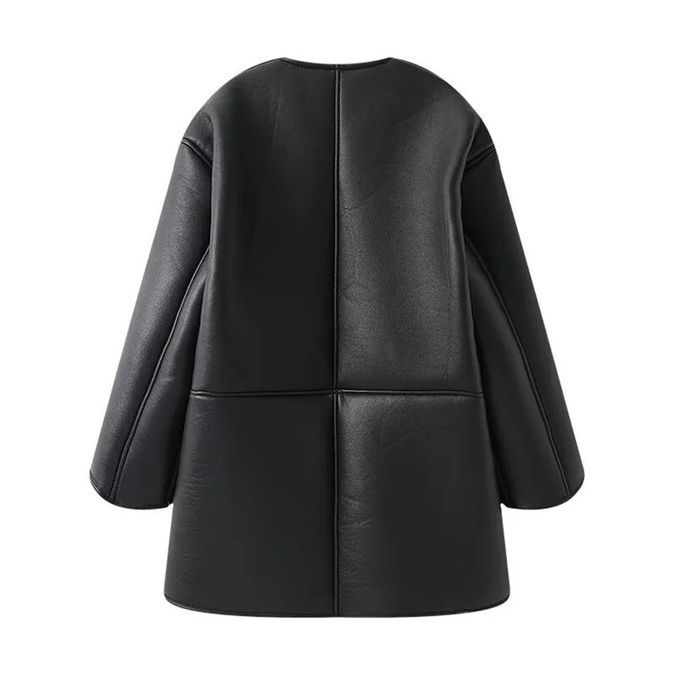 เสื้อกันลมแขนยาวคอกลมสำหรับผู้หญิงแจ็คเก็ตหนังเทียมใหม่สำหรับฤดูใบไม้ร่วงและฤดูหนาว