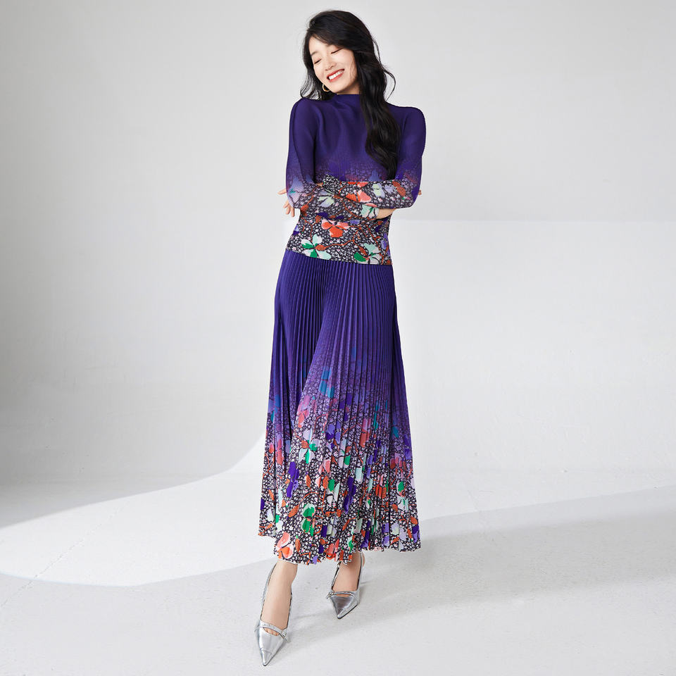 Miyake เสื้อยืดและกระโปรงพลีทพิมพ์ลายลำลองสำหรับผู้หญิงชุด2ชิ้นชุดหนึ่งชุดผ้าโพลีเอสเตอร์100% แบบปรับแต่งได้