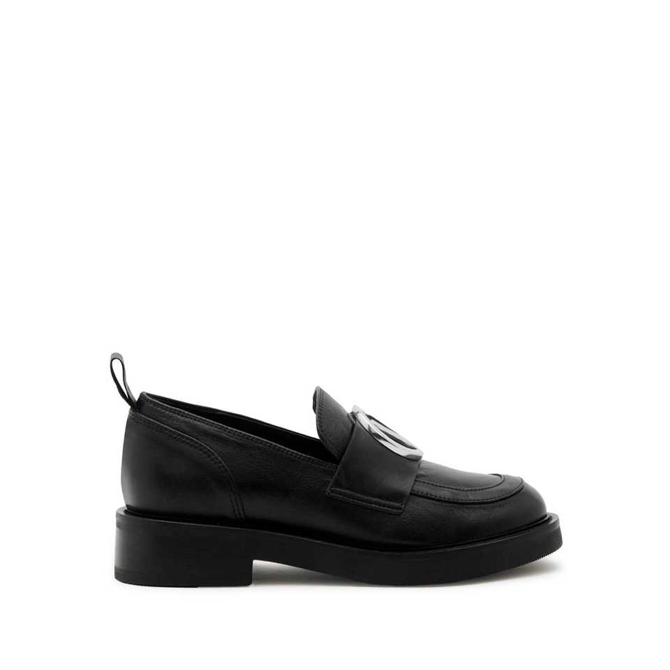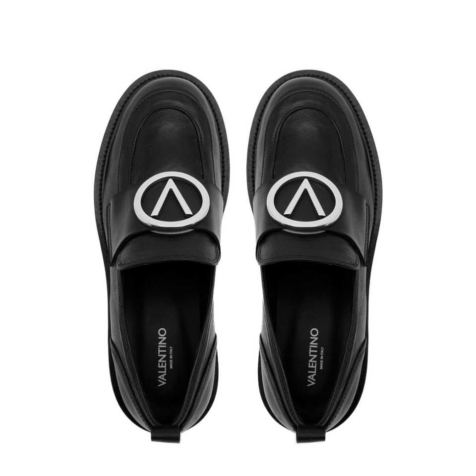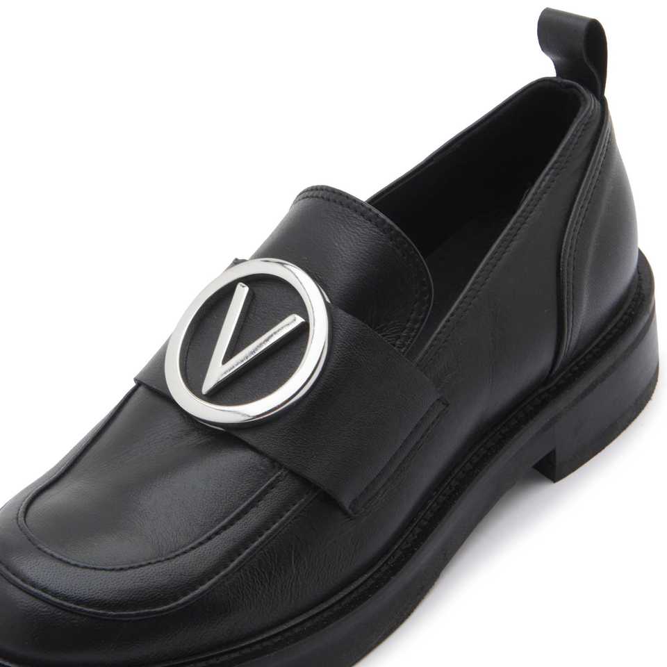 รองเท้าส้นเตี้ยแบบโมคาซิโนสำหรับผู้หญิง หนังวิตเทลโลสีดำ พร้อมโลโก้ V สีเงิน ส้นสูง 2.5 ซม. สีดำ ไซส์ 35-41 ผลิตในอิตาลี