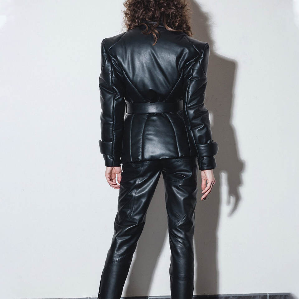 เสื้อแจ็คเก็ตหนังสำหรับผู้หญิง-แฟชั่นฤดูหนาว ระบายอากาศได้ดี ปักลายถัก หนังแกะแท้ ทรงยาว