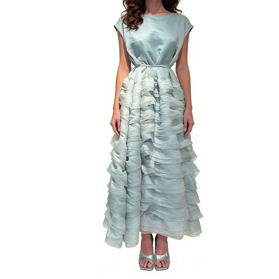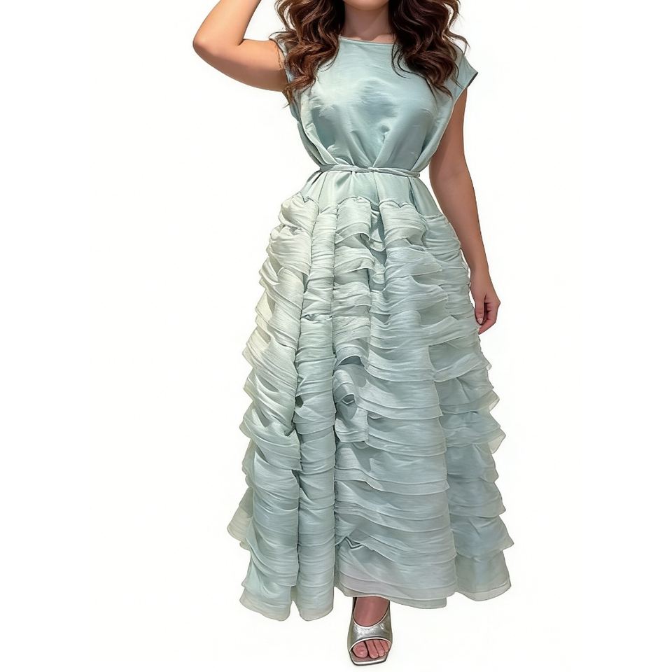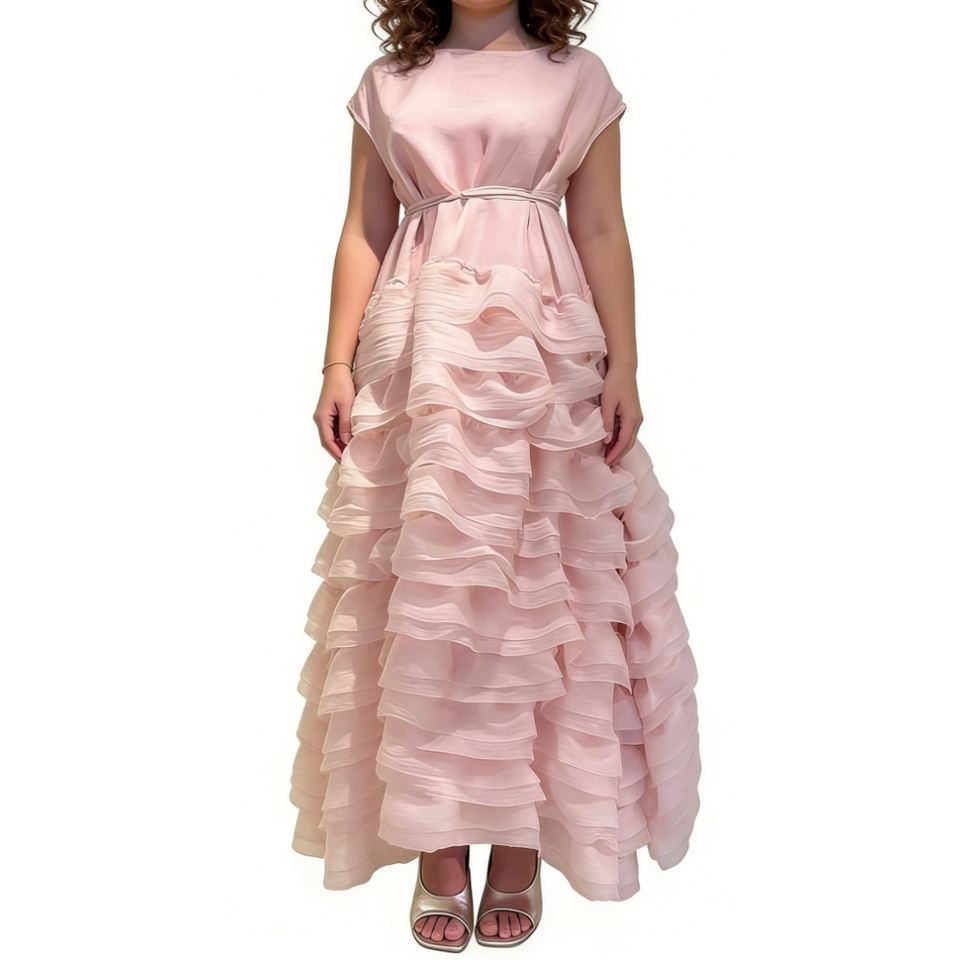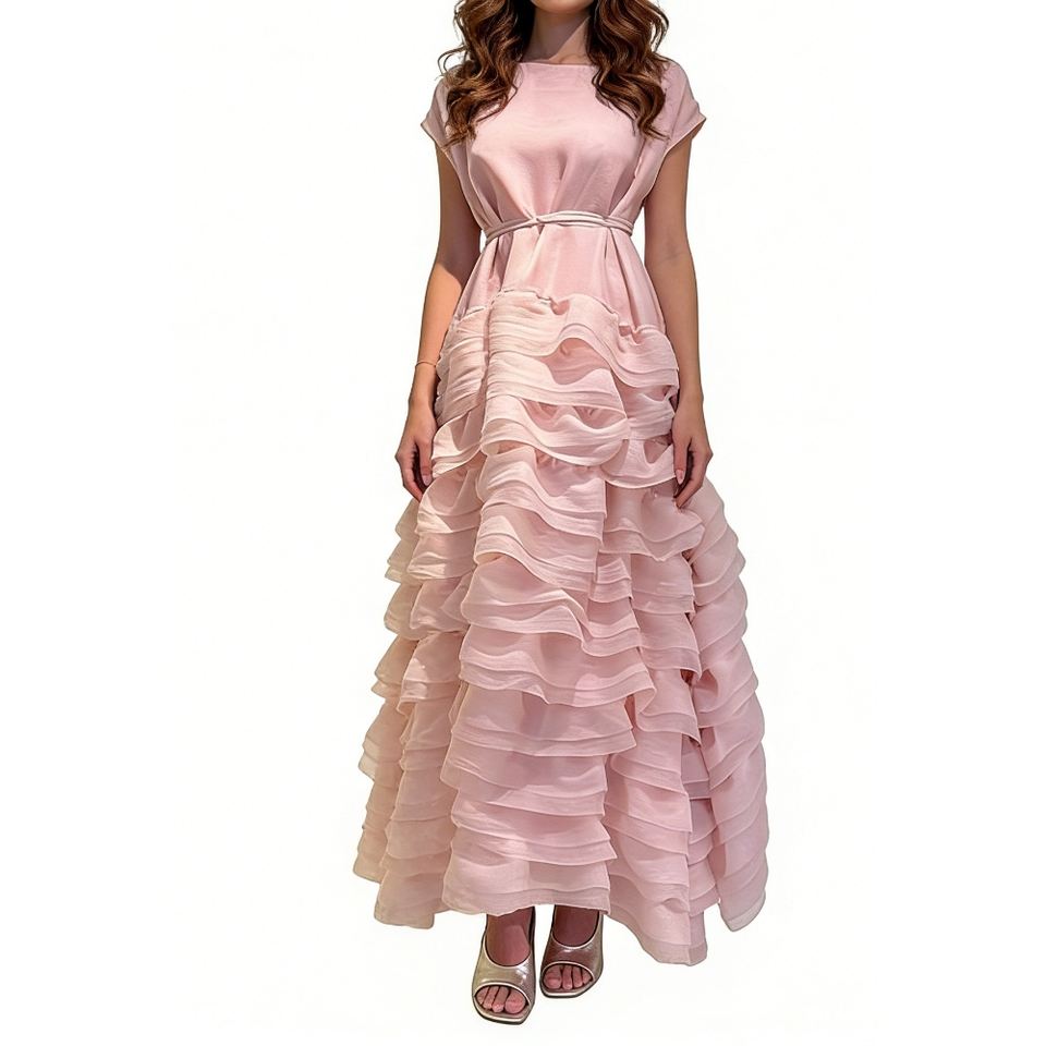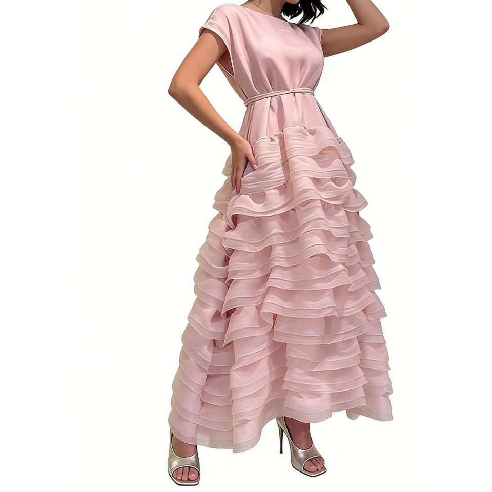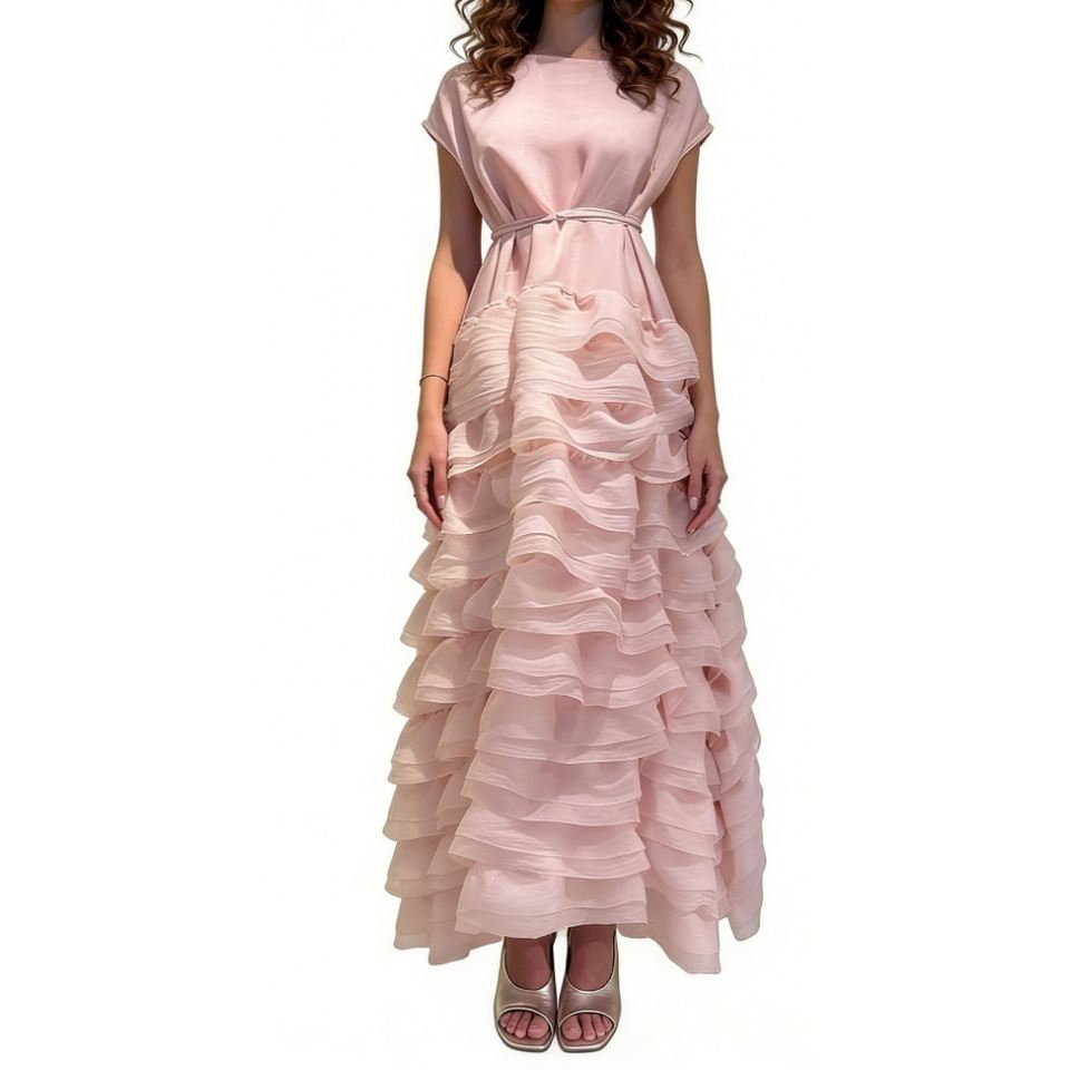 เดรสยาวผู้หญิงหลายชั้นแต่งระบายพร้อมเข็มขัด ดีไซน์หรูหรา โรแมนติก แฟชั่น
