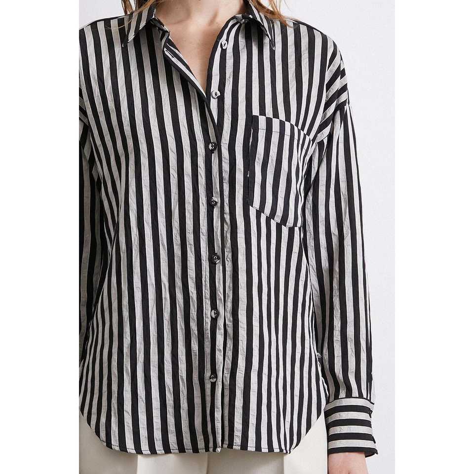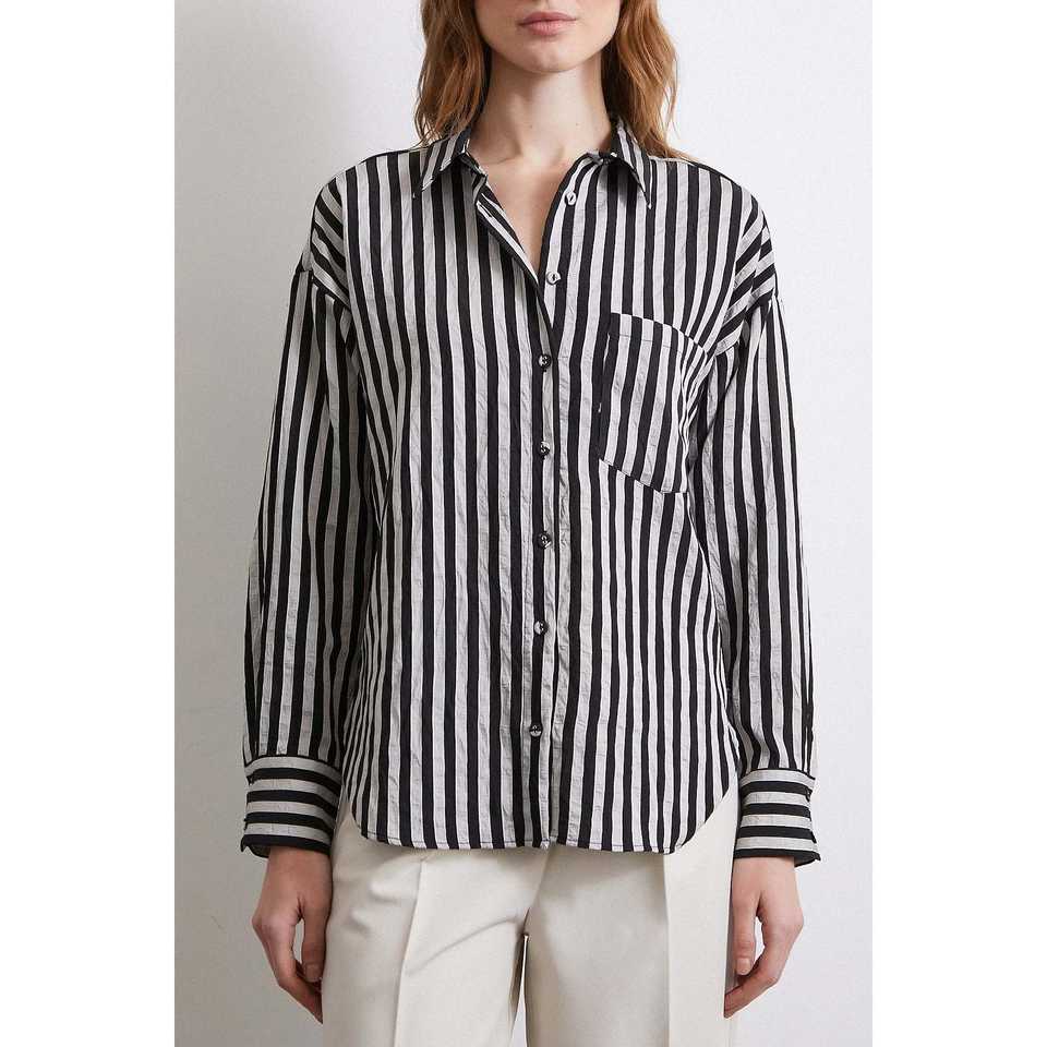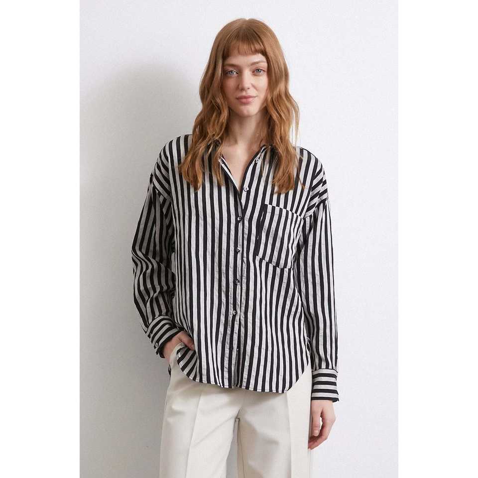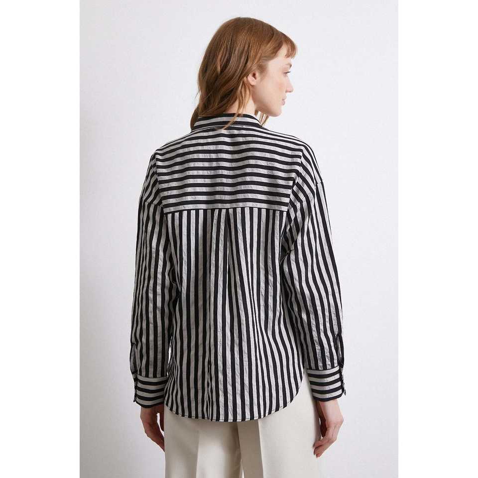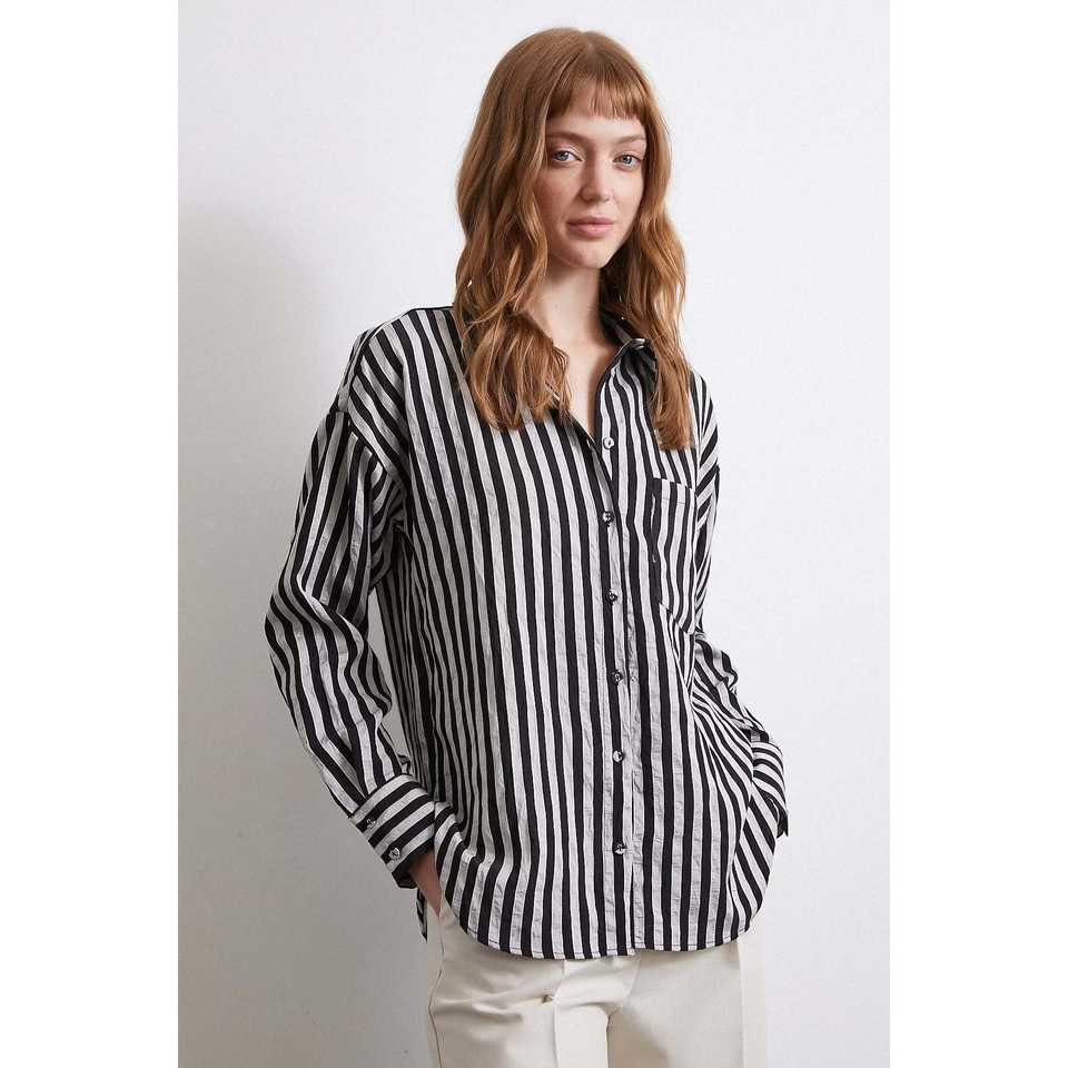 เสื้อเชิ้ตผ้าป๊อปลินลายทางหลากสีสำหรับผู้หญิง ดีไซน์แบบมีแผง ติดกระดุม ใส่สบายๆ ทุกวัน สีเทา